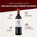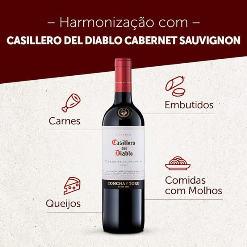 Conteúdo da embalagem: 3x Vinho Casillero Del Diablo Cabernet Sauvignon Reserva Tinto Seco 750ml. Casillero del Diablo Reserva traz toda tipicidade de Cabernet Sauvignon no terroir chileno, frutado, intenso, fresco e saboroso, com breve passagem por carvalho, que amacia os taninos e agrega complexidade. Com uvas provenientes do Vale Central chileno, região reconhecida mundialmente pela extraordinária qualidade dos vinhos tintos que se produz, este exemplar esbanja uma bonita cor rubi profunda, taninos macios e redondos, junto a atrativos aromas de cerejas, groselha e baunilha. Perfeito para acompanhar pratos com média estrutura, como carnes e massas ao molho vermelho. Aroma: Notas marcadas de cerejas, groselhas e ameixas pretas, com toques sutis de baunilha. Sabor: Estrutura firme, ótima concentração de frutas, com taninos elegantes e suculentos e um acabamento longo. Cor: Rubi intenso. Harmonização: Opte por pratos de média estrutura, carnes vermelhas magras assadas ou grelhadas, carnes brancas mais intensas, molhos à base de tomate, queijos ou especiarias. Dicas: filé com fritas, pizza calabresa, carne de panela, espaguete ao sugo. Temperatura de serviço: 15 °C. Uva: Cabernet Sauvignon País - Região: Chile - Valle Central Classificação: Seco Amadurecimento: Breve passagem por carvalho Teor alcoólico: 13% Volume: 750ml Se for dirigir não beba. Conteúdo para maiores de 18 anos. Todas as informações divulgadas são de responsabilidade do fabricante/fornecedor. Imagens meramente ilustrativas.
