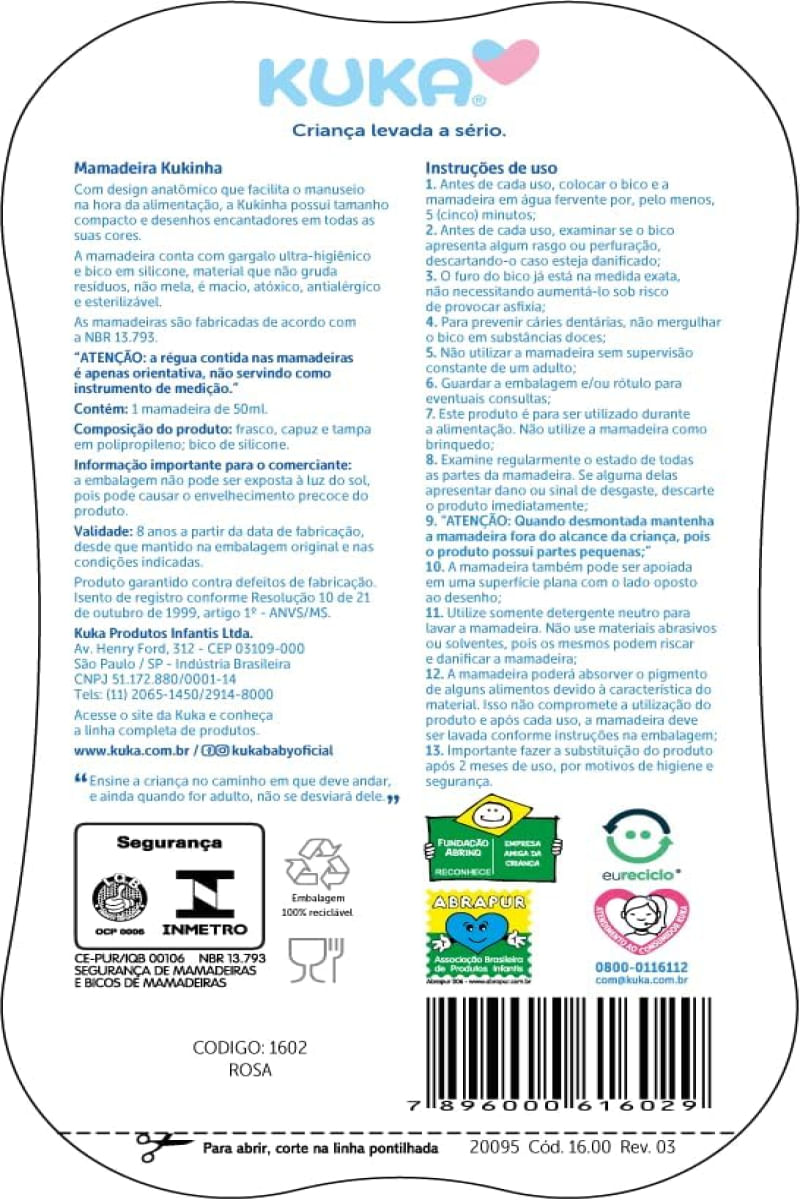 A Mamadeira Kukinha 50ml da Kuka possui o frasco anatômico e gargalo ultra-higiênico sem bordas ou rebarbas cortantes e não retém resíduos alimentares. O bico de silicone é macio, atóxico, antialérgico, esterilizável, inodoro, não mela e é resistente à fervura. Composição:- Frasco, capuz e tampa em polipropileno;- Bico em silicone