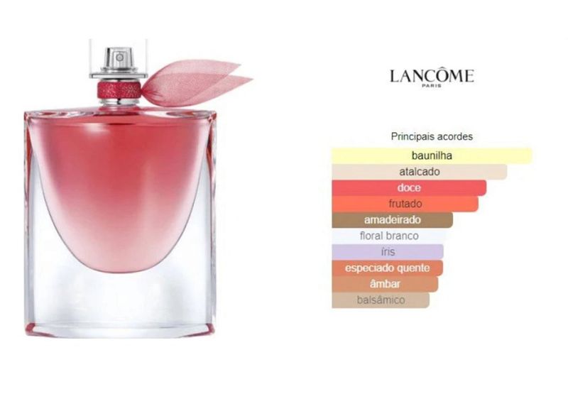 Descrição La Vie Est Belle Intense é uma fragrância feminina envolvente e sofisticada, que aprofunda a assinatura gourmand da linha. Seu aroma combina doçura intensa com elegância floral. Origem Perfume desenvolvido pela marca francesa Lancôme. Duração A fixação varia conforme a pele, o clima e a intensidade da aplicação. Família Olfativa Oriental Gourmand Pirâmide Olfativa Notas de Topo: Frutas vermelhas e bergamota Notas de Coração: Íris, flor de laranjeira e jasmim Notas de Fundo: Baunilha, patchouli e benjoim