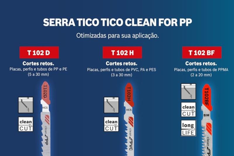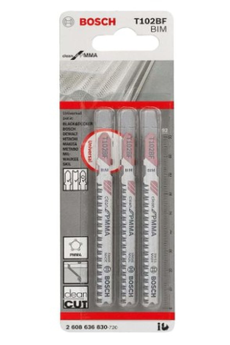 A Lâmina de Serra Tico Tico da Bosch foi desenvolvida para cortes limpos em placas de PMMA;Características:- Bimetal;- Cruzado;- Dentes afiados nos flancos;- Placas de PMMA: 2 - 20 mm;- Comprimento de dentes: 92 mm;- Espaço entre os dentes: 1,8 mm;- Modelo: T 102 BF;- Referência do Fornecedor: 2 608 636 830;- Marca: BOSCH.SKU: 00743538