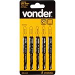 Lâmina de Serra Tico-tico, VD 111c Vonder - Conteúdo da embalagem: 1 Cartela com 5 lâminas. Aplicação: Indicada para plásticos, madeiras e derivados. Destaques: Proporciona cortes rápidos e precisos. Referência: 4633100111 Garantia - E (CDC): Garantia legal: 90 dias Massa aproximada (peso): 4g kg Tipo de encaixe: Encaixe tipo "T" Material da serra tico-tico: Aço de alto teor de carbono (HCS) Nº dentes/pol: 8 dentes Quantidade de peças: 5 peças Comprimento total: 100 mm Comprimento de corte: 75 mm Destaques Comercial: Proporciona cortes rápidos e precisos. Aplicação Comercial: Indicada para plásticos, madeiras e derivados. Características Gerais do Produto: Garantia: • 3 Meses