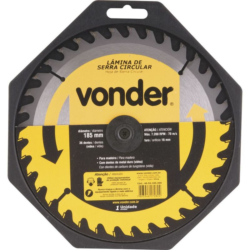 Lâmina de Serra Circular Vonder 235x30x3,0mm 36D 5600 RPMDescubra a eficiência e durabilidade da Lâmina de Serra Circular Vonder, projetada para oferecer cortes precisos e de alta qualidade em madeiras e seus derivados. Com um corpo robusto em aço carbono e dentes de metal duro/vídea, esta lâmina garante uma vida útil prolongada, proporcionando economia e eficiência em seus projetos. Ideal para profissionais e entusiastas do DIY, a lâmina Vonder é sinônimo de confiança e desempenho superior. A Vonder é uma marca reconhecida pela qualidade e inovação em ferramentas, garantindo que você tenha sempre o melhor em suas mãos. Com esta lâmina, você terá cortes limpos e precisos, reduzindo o tempo de trabalho e aumentando a produtividade. Ah, e não se esqueça: a segurança é primordial! Nunca exceda a rotação máxima de 5600 RPM e evite cortar madeiras impregnadas com massa ou cimento para preservar a integridade da lâmina.ESPECIFICAÇÕES TÉCNICAS- Marca: Vonder- Código Universal de Produto: 7893946217907- Modelo: 7893946217907- Diâmetro da lâmina: 235 mm (9.1/4")- Número de dentes: 36- Espessura de corte: 3,0 mm- Espessura do corpo: 2,0 mm- Diâmetro do furo: 30 mm- Rotação máxima: 5600 RPM- Velocidade periférica: 70 m/sFUNÇÕES E CARACTERÍSTICAS- Ideal para cortar madeiras e derivados- Corpo em aço carbono com dentes de metal duro- Alta durabilidade e resistência ao desgasteCOMPATIBILIDADE- Compatível com serras circulares que suportem lâminas de 235 mm e furo de 30 mmINSTRUÇÕES DE USO1. Verifique se a lâmina está devidamente instalada antes de usar.2. Não exceda a rotação máxima de 5600 RPM.3. Evite cortar materiais impregnados com massa ou cimento.4. Armazene a lâmina em local seco e seguro após o uso.