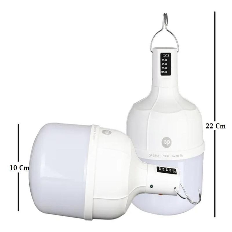 A Lâmpada de Emergência DP LED Recarregável USBA lâmpada LED bulbo com luz de emergência é uma opção prática e conveniente para iluminar ambientes com qualidade e ainda contar com uma função de luz de emergência para situações inesperadas.Com uma potência de 38W e uma bateria de 4000mAh, ela é capaz de iluminar por até 4 horas seguidas em modo de emergência, além de ter um tempo de carga rápido de apenas 3 horas. Com uma conexão USB para recarga, é possível carregá-la em qualquer lugar e tê-la sempre à mão para qualquer eventualidade.Além disso, a lâmpada LED bulbo oferece uma luz de qualidade, com temperatura de cor branca, ideal para iluminar ambientes residenciais ou comerciais.Com Gancho é perfeita para FEIRA, ÁREA EXTERNA, CAMPING, EMERGÊNCIA!A lâmpada LED poupa energia e tem proteção ambiental.Características:- MODELO : DP-7814- BATERIA :4000mAh (durabilidade ate máximo 10h)- RECARREGÁVEL : 5V USB (qualquer adaptador USB de celular NÃO INCLUSO)- POTÊNCIA :38W- Tamanho da lampâda: 22 C x 10 L Cm- Porta de carregamento USBOBS: Ao recarregar use o cabo USB V8 incluso na embalagem para conectar o adaptador USB e entrada de luz de emergência, 4 luzes começam a piscar quando a bateria embutida estiver totalmente recarregadaItens da Embalagem:1 - Lampada Led 38w1 - Cabo USB V8COMO USAR:RECARREGUE ANTES DE USAR .APERTAR O BOTÃO 1 VEZ: ACENDE LUZ FRACA.APERTA 2 VEZES: ACENDE LUZ MEDIANA.APERTA 3 VEZES: ACENDE LUZ FORTE.APERTA MAIS UMA VEZ PARA DESLIGAR.