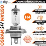 Lâmpada Halógena Osram Original H4 75/70W 24V 24V - Caminhão Com tecnologia alemã e qualidade original de fábrica, a Lâmpada Halógena Osram 24V oferece excelente desempenho em iluminação, proporcionando mais segurança, visibilidade e conforto ao dirigir, seja na cidade ou na estrada. Ideal para quem busca durabilidade, fácil instalação e luz confiável em qualquer condição. Especificações Técnicas: • Marca: Osram • Modelo: H4 • Potência: 75/70W 24V • Tecnologia: Halógena • Tensão: 24V • Tipo de soquete: P43t • Lúmens: 1.900 lm • Cor da luz: Branco Quente (aproximadamente 3200K). • Aplicação: Faróis principais de caminhões e veículos pesados. • Vida útil otimizada para uso diário. • Instalação fácil, sem adaptações. • Homologada pelo Inmetro Conteúdo da Embalagem: • 01 Lâmpada Halógena Osram Original H4 Importante: • Garantia de 90 Dias. • Valor Unitário.