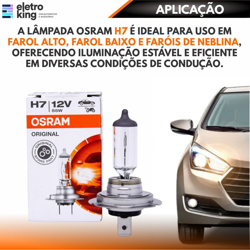 Lâmpada Halogena Osram Original H7 55W 12V Com tecnologia alemã e qualidade original de fábrica, a Lâmpada Halógena Osram 12V oferece excelente desempenho em iluminação, proporcionando mais segurança, visibilidade e conforto ao dirigir, seja na cidade ou na estrada. Ideal para quem busca durabilidade, fácil instalação e luz confiável em qualquer condição. Especificações Técnicas: • Marca: Osram • Modelo: H7 • Potência: 55W • Tecnologia: Halógena • Tensão: 12V • Tipo de soquete: PX26d • Lúmens: 1500 lm • Cor da luz: Amarelada (aproximadamente 3200K). • Aplicação: Farol baixo, farol alto ou farol de neblina (dependendo do veículo). • Vida útil otimizada para uso diário. • Compatível com veículos que utilizam lâmpadas H7 12V. • Instalação fácil, sem adaptações. • Homologada pelo Inmetro Conteúdo da Embalagem: • 01 Lâmpada Halógena Osram Original H7 Importante: • Garantia de 90 Dias. • Valor Unitário.