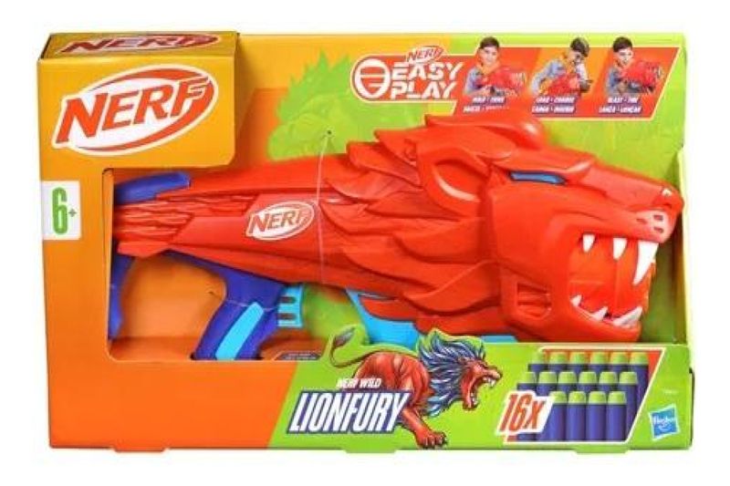 Os lançadores Nerf Junior Wild possuem design fácil de brincar para que as crianças se divirtam em aventuras dentro e fora de casa. São lançadores feitos para caber confortavelmente em mãos pequenas. São leves e podem ser segurados facilmente pelas crianças. Possuem alavanca de disparo mais fácil e leve de ativar. Os dardos Nerf são facilmente inseridos no lançador. Esses recursos permitem que as crianças se divirtam por conta própria nas aventuras Nerf. Eles são perfeitos para meninos e meninas iniciantes em brincadeiras com dardos Nerf. O lançador Nerf Junior Wild Lionfury tem um divertido design de leão com cores vivas e detalhes incríveis! Este lançador Nerf Inclui 16 dardos de espuma flexível Nerf Elite 2.0. Recomenda-se o uso de óculos, não incluídos.