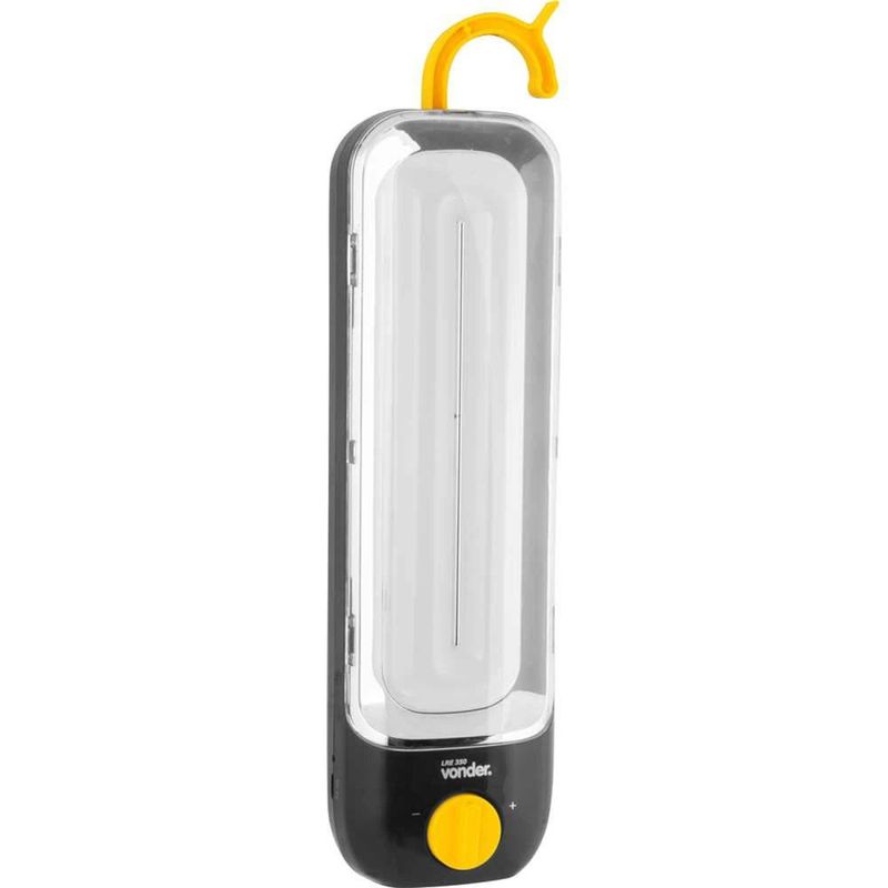 Lanterna Recarregável de Emergência, Bateria de Lítio, LRE 350, Vonder - Conteúdo da embalagem: 1 Lanterna. Acompanha: 1 cabo USB. Aplicação: Indicada para uso como lanterna de emergência. ATENÃÃO: o acionamento da lanterna deve ser realizado de forma manual, a lanterna não irá acender automaticamente em caso de falta de energia. Destaques: Lanterna recarregável com alimentação Micro USB 5 V DC. Possui seletor de nÃvel de iluminação para se adequar de acordo com a necessidade da operação e garantir economia da bateria. Referência: 8075052350 Garantia - E (CDC): Garantia legal: 90 dias Material: Plástico Quantidade de LEDs: 52 LEDs SMD Fluxo luminoso (lúmen): 350 lm Modelo: LRE 350 Massa aproximada (peso): 0,320 kg Cor: Preta e amarela Comprimento total da lanterna: 236 mm Tempo de carga: Aproximadamente 5h Bateria: Ãons de lÃtio Entrada de carregamento: Micro USB 5V DC Destaques Comercial: Lanterna recarregável Micro USB 5 V DC com seletor de intensidade e economia de bateria. Aplicação Comercial: Usada como lanterna de emergência; acionamento manual, não acende automaticamente sem energia. Características Gerais do Produto: Garantia: • 3 Meses
