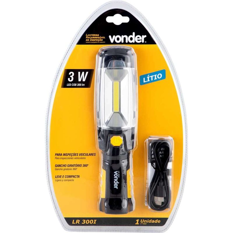 Lanterna Recarregável de Inspeção, 3 W COB + 6 Leds, LR 300i, Vonder - Conteúdo da embalagem: 1 Lanterna. Acompanha: 1 cabo USB. Aplicação: Indicada para inspeções veiculares, para prestadores de serviço e profissionais que necessitam realizar trabalhos em locais com pouca iluminação, conta com LED com alta potência e um LED auxiliar para iluminação direcionada. Temperatura de cor: 6.500 K +/- 10%. Destaques: Leve, compacta e de fácil adaptação, pois possui base magnética para fixação em superfÃcies metálicas, giratória (360°) e inclinável (180°), gancho giratório (360°), deixando as mãos livres para realização das atividades. Possui corpo em ABS emborrachado resistente a impactos, bateria recarregável 3,7 V 2.600 mAh de lÃtio que permite o carregamento facilmente em qualquer tomada USB, conta também com uma saÃda USB 5V 1A para alimentar outros dispositivos. ** Tecnologia LED COB, Chip On Board (chip integrado na placa), é uma tecnologia mais moderna e recente de iluminação. Seu principal diferencial é a melhora no desempenho, pois proporciona uma luz multidirecional. Ou seja, a luminosidade é igual em todos os pontos. Isso ocorre devido à capacidade de alojar nove ou mais LEDs dentro de um único agrupamento. O LED COB tem mais eficiência, já que trabalha apenas com dois contatos e um circuito. Ele costuma ter uma vida útil maior e, por conta da alta potência, é ideal para utilização externa, iluminações industriais e galpões. Referência: 8075030300 Garantia - E (CDC): Garantia legal: 90 dias + Garantia contratual: 9 meses Modelo: LR 300I Massa aproximada (peso): 0,4 kg Tensão (V): 5 V DC / 1 A (cabo de carregamento micro USB) Material da lanterna: Plástico ABS com acabamento emborrachado Comprimento total da lanterna: 245,0 mm Fluxo luminoso (lm): LED: 25 lúmens / LED COB: 300 lúmens Quantidade de LEDs da lanterna: LED COB (Principal) e 6 LEDs (Superior) Tempo de carga: 4 horas Autonomia aproximada: LED COB: 4h / LED: 20h Cor da lanterna: Preta/amarela Tipo do LED: COB Bateria: Ãons de LÃtio Entrada de carregamento: USB Micro Tipo de lâmpada: LED Cob Alimentação da lanterna: Recarregável Destaques Comercial: Lanterna LED COB compacta, com base e gancho magnéticos giratórios, corpo em ABS resistente, bateria recarregável e saÃda USB 5V 1A, ideal para uso externo e industrial. Aplicação Comercial: Indicada para inspeções e trabalhos em locais com pouca luz, possui LED de alta potência e LED auxiliar 6.500K. Características Gerais do Produto: Garantia: • 3 Meses