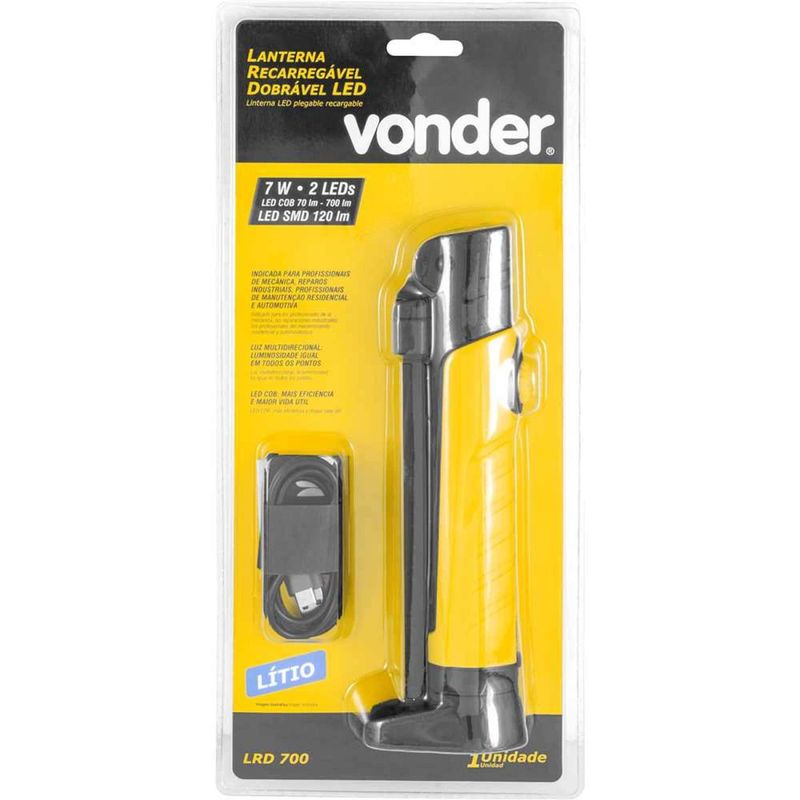 Lanterna Recarregável Dobrável Led, LRD 700, Vonder - Conteúdo da embalagem: 1 Lanterna recarregável. Acompanha: 1 cabo para carregamento USB tipo C. Aplicação: Indicada para profissionais de mecânica, reparos industriais, profissionais de manutenção residencial e automotiva. Ao primeiro toque no botão giratório, o LED do topo da lanterna se aciona; no segundo toque no botão giratório, aciona-se o LED lateral (que possui ajuste de luminosidade); e para desligar a lanterna, é necessário pressionar o botão durante 3 segundos. Quando a bateria estiver fraca, a luz de LED que estiver acionada irá piscar 3 vezes e o primeiro LED informativo de carga da lanterna irá piscar VERDE ininterruptamente, informando que a lanterna precisa ser carregada. No processo de carga, os LEDs irão se acender e permanecer acesos conforme o nÃvel de bateria. Quando os 3 LEDs estiverem acessos continuamente, a bateria estará com carga completa. Temperatura da cor: 6.500 K. Destaques: Possui ajuste de intensidade de luminosidade através de botão giratório de acordo com a necessidade do profissional, cabo emborrachado, cabeça rotativa, base magnética e gancho inferior que proporciona facilidade e eficiência na utilização. Conta com 3 LED's indicadores de nÃvel da bateria. à resistente a quedas (IK07) e spray de água (IP54). Bateria recarregável 3,7 V 2.600 mAh - LÃtio. .** Tecnologia LED COB, Chip On Board (chip integrado na placa), é uma tecnologia mais moderna e recente de iluminação. Seu principal diferencial é a melhora no desempenho, pois proporciona uma luz multidirecional. Ou seja, a luminosidade é igual em todos os pontos. Isso ocorre devido à capacidade de alojar nove ou mais LEDs dentro de um único agrupamento. O LED COB tem mais eficiência, já que trabalha apenas com dois contatos e um circuito. Ele costuma ter uma vida útil maior. Referência: 8075060700 Garantia - E (CDC): Garantia legal: 90 dias + Garantia contratual: 9 meses Modelo: LRD 700 Massa aproximada (peso): 0,608 kg Tensão (V): Carregamento via cabo USB tipo C (não acompanha plugue) Material da lanterna: Plástico e borracha Diâmetro da lente da lanterna: 5,0 mm (topo) Fluxo luminoso (lm): 70 lm - 700 lm (Led aba Lateral) / 120 lm (Led do topo) Quantidade de LEDs da lanterna: 2 (1 frontal SMD e 1 lateral COB) Tempo de carga: Aproximadamente 4 horas Autonomia aproximada: 16h (Ajuste mÃnimo) / 2h (Ajuste máximo) Cor da lanterna: Amarela e preta Bateria: 3,7 V 2.600 mAh - ions de LÃtio Entrada de carregamento: USB Tipo C Comprimento total da lanterna: 399 mm (aberta) Tipo de lâmpada: Frontal: LED / Lateral: LED cob Alimentação da lanterna: Recarregável Destaques Comercial: Lanterna com ajuste de luminosidade via botão giratório, LED COB, base magnética, cabeça rotativa, resistência IK07/IP54 e bateria recarregável 3,7V 2600mAh. Aplicação Comercial: Lanterna para uso mecânico e manutenção, com LEDs acionados por botão giratório, ajuste de intensidade, aviso de bateria fraca e carga indicada por LEDs. Temperatura de cor 6500K. Características Gerais do Produto: Garantia: • 3 Meses