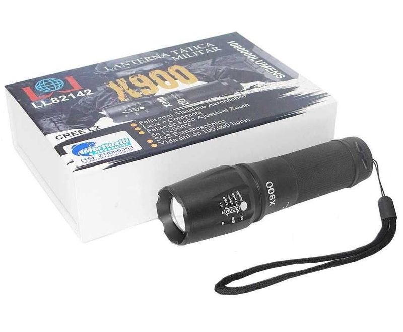 Lanterna Tática MilitarCaracterísticas do produto:Leve e compactaFeixe de foco ajustávelZoom de 1-2000xSos EstroboscópicoProduto de ótima qualidadeModelo: X900Fácil ManuseioCor: PretoItens Inclusos: 1 Lanterna de Led Recarregável - 2.800.000 Lumes1 Bateria Recarregável1 Adaptador para usar com baterias 186501 Fonte Bivolt1 Carregador Veicular Perfeita para usar em situações táticas ou em atividades ao ar livre. A lanterna tem ótima qualidade, é versátil e capaz de impressionar com a sua potência de longo alcance. Essa ferramenta é indispensável para atividades como montanhismo, trilhas, escalada, camping, sobrevivência, caminhadas, pescaria, patrulha, policiais, bombeiros e etc.