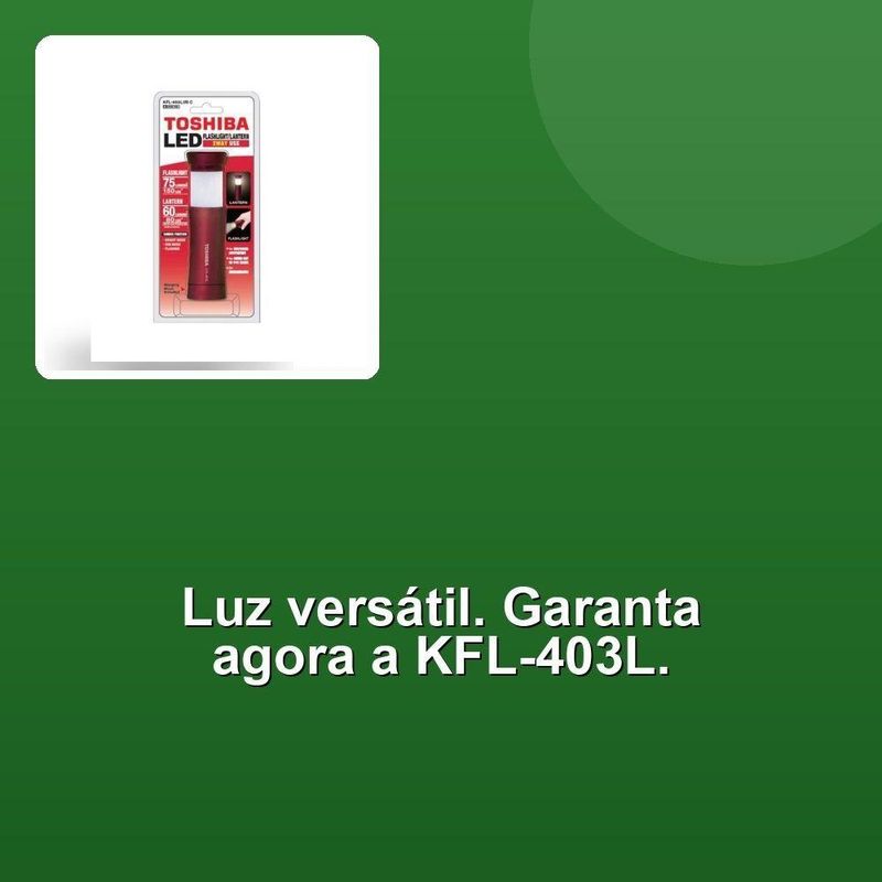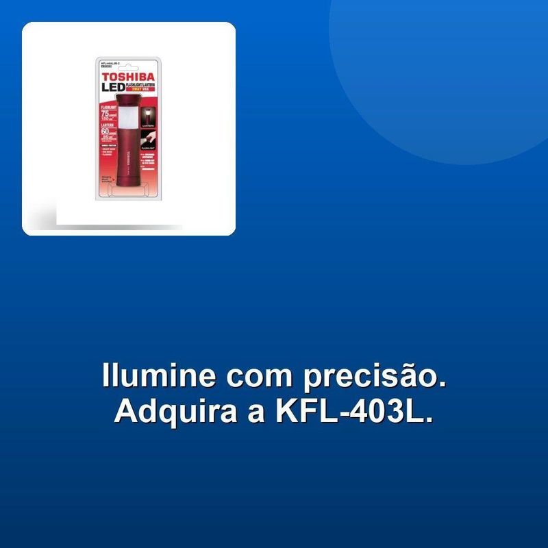 Lanterna Toshiba 2way Kfl-403l VermelhaA Lanterna Toshiba 2WAY KFL-403L é uma escolha excelente para quem busca uma iluminação versátil e poderosa. Com seu design bidirecional, oferece duas opções de luz: uma brilhante de 75 Lumens / 150LUX e outra de 60 Lumens / 80LUX, atendendo às suas necessidades de iluminação de forma eficaz.Leve e compacta, com apenas 88g e dimensões de 39 x 101~141mm, é fácil de transportar e armazenar, tornando-a uma companheira ideal em qualquer situação. Além disso, a lanterna é equipada com uma função Dimmer Blight/DIM/Piscando, proporcionando flexibilidade e controle sobre a intensidade da luz.Com um prático gancho para pendurar, a lanterna Toshiba 2WAY KFL-403L é conveniente e prática, podendo ser levada para onde quer que você vá. Disponível na cor vermelha, é uma opção estilosa e funcional para qualquer ocasião. Com uma alimentação de 3 unidades AAA, a lanterna é facilmente recarregável e pronta para uso.A Lanterna Toshiba 2WAY KFL-403L é uma escolha excelente para quem busca uma iluminação versátil e poderosa. Com seu design bidirecional, oferece duas opções de luz: uma brilhante de 75 Lumens / 150LUX e outra de 60 Lumens / 80LUX, atendendo às suas necessidades de iluminação de forma eficaz.Leve e compacta, com apenas 88g e dimensões de 39 x 101~141mm, é fácil de transportar e armazenar, tornando-a uma companheira ideal em qualquer situação. Além disso, a lanterna é equipada com uma função Dimmer Blight/DIM/Piscando, proporcionando flexibilidade e controle sobre a intensidade da luz.Com um prático gancho para pendurar, a lanterna Toshiba 2WAY KFL-403L é conveniente e prática, podendo ser levada para onde quer que você vá. Disponível na cor vermelha, é uma opção estilosa e funcional para qualquer ocasião. Com uma alimentação de 3 unidades AAA, a lanterna é facilmente recarregável e pronta para uso.