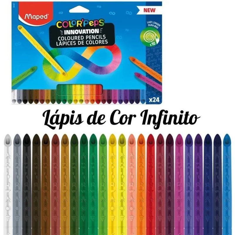 Lápis De Cor Colorpeps Infinity - 24 Unidades - MapedLápis de cor inovadores que duram 10 vezes mais, 100% grafite, 100% aproveitável, 0 desperdício, em conformidade com os regulamentos de brinquedos. Não há necessidade de afiá-los, eles afiam enquanto colorem. Lápis triangular para uma melhor aderência. O design original e patenteado permite que as crianças pintem em ambos os lados. Dê ao seu filho uma caixa com 24 lápis que dura muuuuito mais!Código Interno: 100101Dimensões aprox. da embalagem em cm: 2x22x24Peso liq. Aproximado do produto na embalagem: 150gReferência do Modelo: 861601Conteúdo da Embalagem: 24 CoresComposição/material: Grafite, pigmentos, aglutinantes, carga inerte e ceras.Idade recomendada: a partir de 6 anosGarantia: Garantia: 90 dias contra defeitos de fabricação pelo fabricanteImagens meramente ilustrativas. As cores e tonalidades podem variarUso - EscolarTipo - NormalQuantidade de Cores - 24 CoresCorpo - Triangular