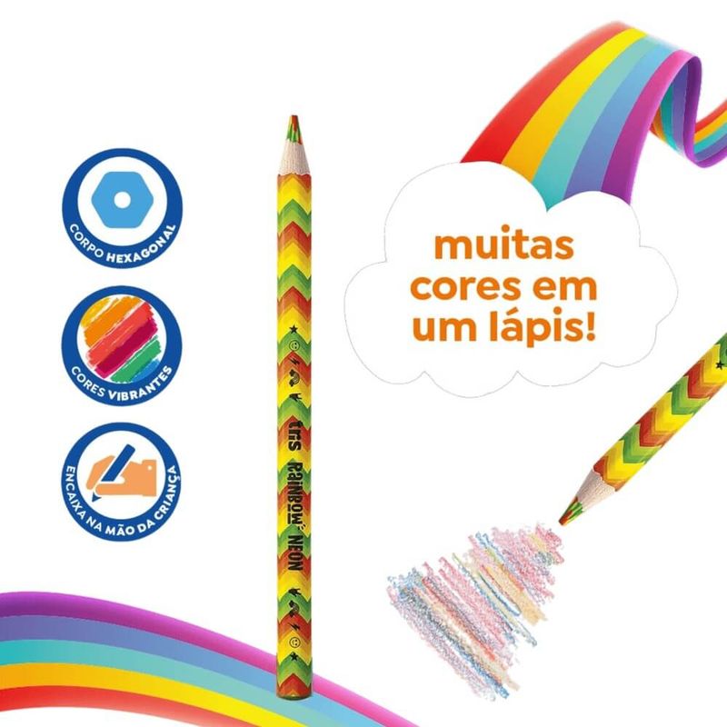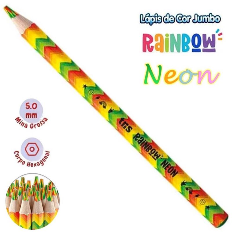 Lápis de Cor Jumbo Rainbow Mina Multicolorida Neon - Tris São muuuuuuuitas cores em um lápis! Lápis de cor tamanho jumbo, com corpo hexagonal em madeira que encaixa na mão! Mina grossa de 5,5mm que evita a quebra. Agora também em tons neon! Com o Lápis de Cor Jumbo Rainbow da Tris você tem total liberdade na hora de pintar, as cores são lindas deixando fácil dar asas a imaginação! Características: - Mina grossa de 5,5mm - Cores Vibrantes - Ótima cobertura- Fácil de apontar - Formato hexagonal que facilita à pega - Traço super macio - Corpo estampado - Pigmentos de alta qualidade - Composição: Madeira, cargas, corantes e aglutinantes. Embalagem com 01 UnidadeImagens meramente ilustrativas, as cores podem variar em cada tela ou monitor.