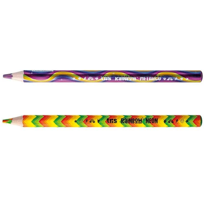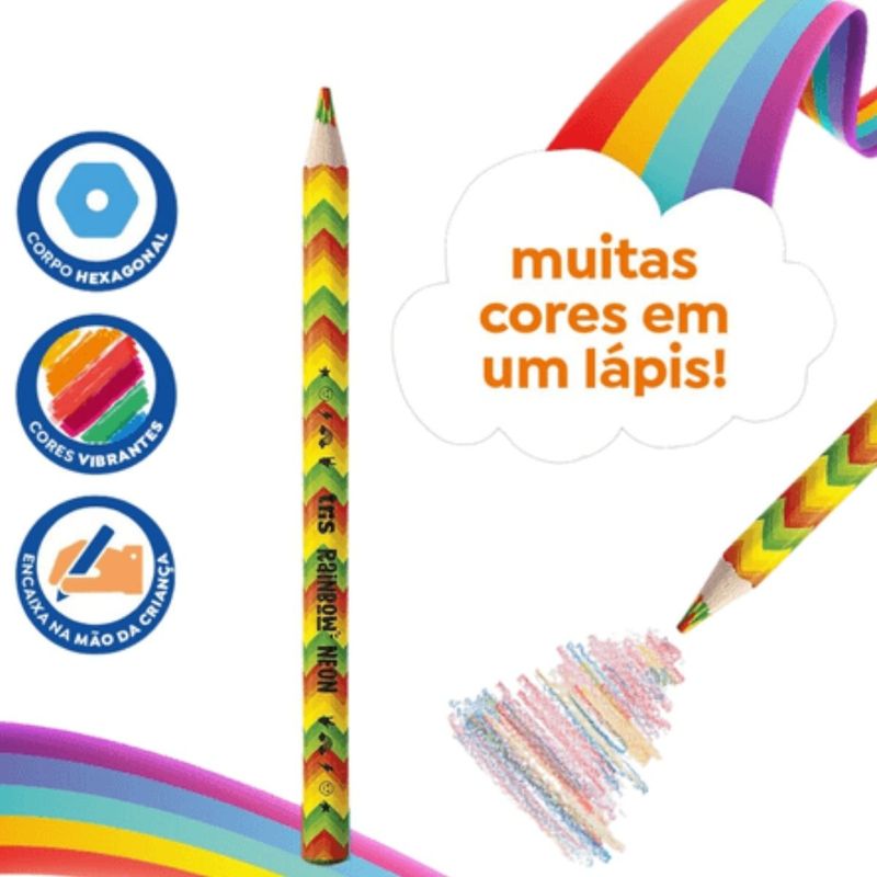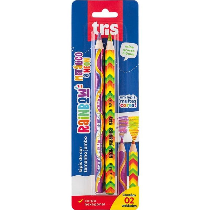 LÁPIS DE COR RAINBOW NEON E METÁLICO CARTELA COM 2 UNIDADES - TRIS São muuuuuuuitas cores em um lápis! Lápis de cor tamanho jumbo, com corpo hexagonal em madeira que encaixa na mão! Mina grossa de 5,5mm que evita a quebra. Agora também na combinação de tons neon e metálico! Características: Marca: Tris Quantidade: Cartela 2 Unidades Indicado: + 3 Anos Registro INMETRO: 001964/2018