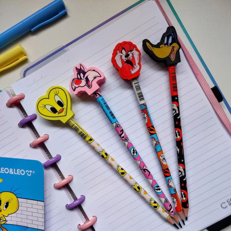 LÁPIS HB COM BORRACHA NA PONTA - LOONEY TUNES - SORTIDO - LEO & LEO Escrever ou desenhar com lápis não será mais a mesma coisa! Com o Lápis HB c/ Borracha na Ponta Looney Tunes Leo&Leo, os personagens mais clássicos e amados por todo mundo serão a companhia ideal para as tarefas do cotidiano, seja na escola ou no trabalho.O lápis tem corpo redondo e 4 estampas fofas e únicas. No topo a borracha é removível, possui 4 formatos diferentes e decorada com 4 estampas divertidas e exclusivas. O material é atóxico e resistente, sendo que o lápis é fácil de apontar, tem traço firme e escreve macio, e a borracha apaga superbem.Para estudar, aprender e trabalhar de maneira alegre e sempre estimulado, basta ter em mãos o Lápis HB c/ Borracha na Ponta Looney Leo&Leo, a companhia mais divertida para todos os dias. INMETRO: OCP 0116 REGISTRO: 006752/2020 ***APÓS A COMPRA ENVIAR MENSAGEM COM COR/PERSONAGEM DESEJADO, SE TIVERMOS EM ESTOQUE, LHE ENVIAREMOS!***