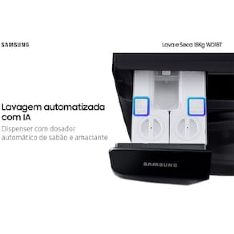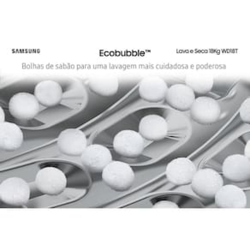 Se você procura uma lavadora moderna, a Lava e Seca Samsung WD18T, é perfeita. Ela tem capacidade para lavar 18kg de roupas e secar 10kg em um mesmo ciclo. Economia de tempo, água e energia para você e toda a sua família.Com um painel de controle intuitivo, essa máquina de lavar inteligente e conectada identifica os hábitos de lavagem da sua família e recomenda os seus ciclos favoritos. Ela ainda exibe durante a lavagem as informações mais importantes. Quer tornar o processo ainda mais simples? Com o app SmartThings você pode programar o horário da sua lavagem, obter dicas e recomendações do ciclo ideal, e até mesmo receber ajuda para conservar sua máquina.Prática, possui lavagem com IA utilizando 4 sensores inteligentes que identificam automaticamente a carga de roupas e calculam a quantidade ideal de água e sabão. E mais, sua tecnologia exclusiva Ecobubble produz bolhas de sabão que tornam a lavagem muito mais cuidadosa e poderosa.É a Lava e Seca da Samsung que vai revolucionar sua lavanderia!