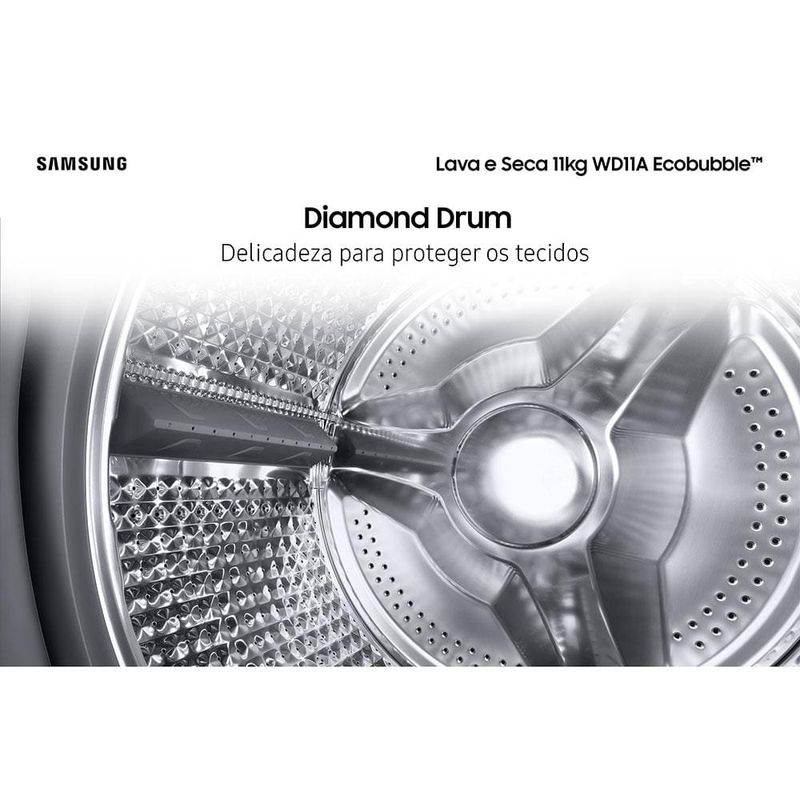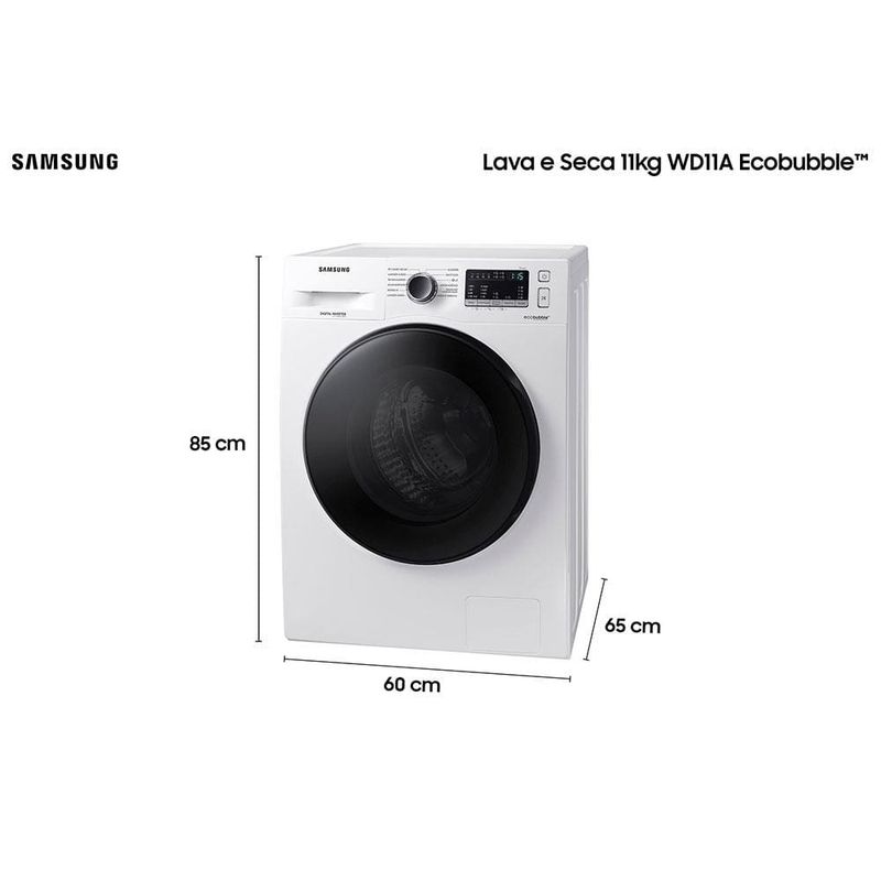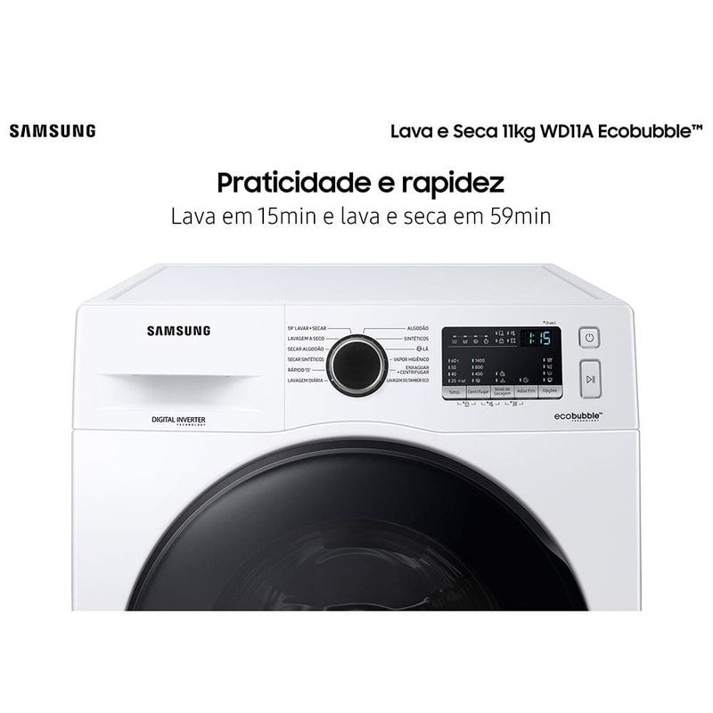 Com a Lava e Seca Samsung WD11A Branca você terá suas roupas limpinhas com mais eficiência e praticidade, cuidando dos tecidos e economizando água e energia. Isso mesmo! É a máquina perfeita para facilitar o seu dia, pois ela lava, seca e esteriliza suas roupas. Além dos Ciclos de lavagem a Seco e Vapor de Higiene que ajudam a eliminar odores, bactérias e alérgenos prejudiciais à saúde, a WD11A da Samsung tem ao seu dispor a tecnologia exclusiva Ecobubble que facilita em 40x a penetração do sabão no tecido, provendo uma lavagem mais eficaz, mesmo com água fria. Ela conta, também, com ciclos de lavagem rápida de 15 min destinado a pequenas cargas e lava e seca de 59 min, proporcionando mais praticidade e tempo para você. Tem roupas com manchas mais difíceis de serem removidas? A Lava e Seca Samsung WD11A vai te ajudar com uma função exclusiva que deixa as roupas completamente de molho em água com bolhas para uma lavagem mais eficaz. Além de moderna e eficiente, esta Lava e Seca da Samsung apresenta o tambor Diamond Drum que protege os tecidos, reduzindo o atrito e prevenindo que suas roupas desfiem durante a lavagem. São muitos benefícios que a Lava e Seca WD11A traz e ainda com um motor com tecnologia Digital Inverter que, além de mais econômico, emite menos ruído. A melhor escolha para facilitar suas tarefas diárias. Aproveite!
