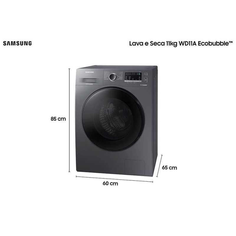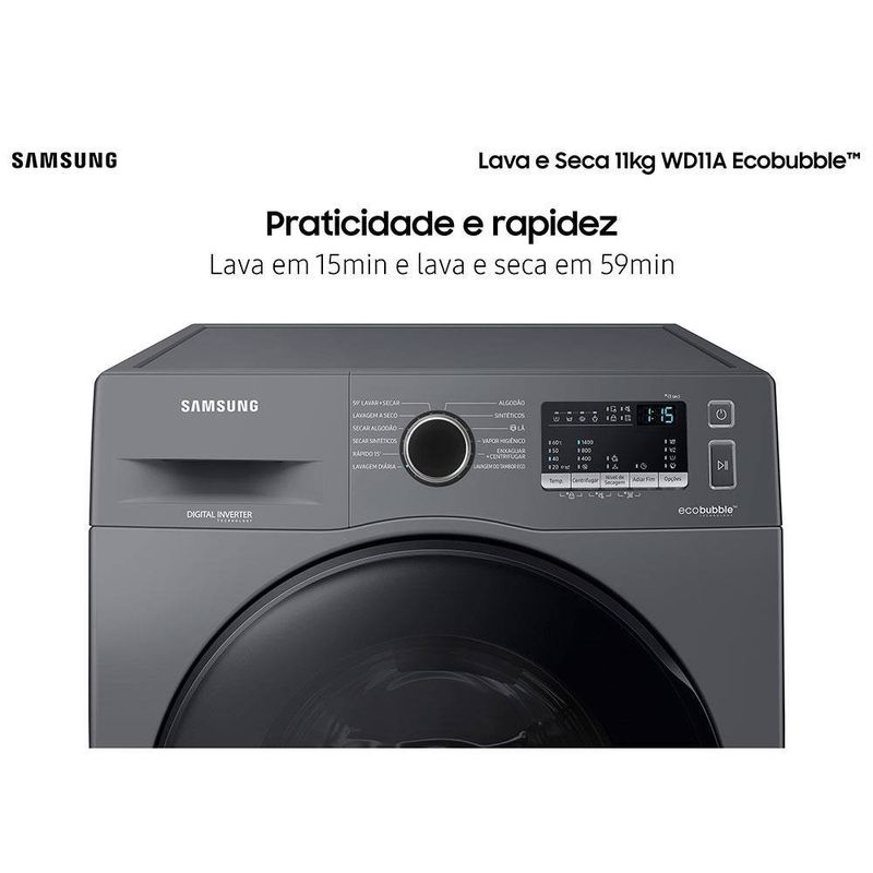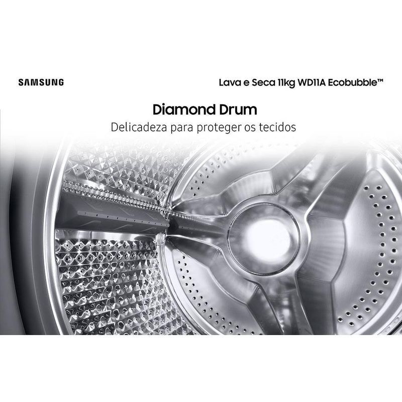 Lave e seque suas roupas com mais eficiência, cuidando dos tecidos e economizando água e energia com a Lava e Seca Samsung WD11A Inox Look!Uma máquina perfeita para facilitar o seu dia, pois ela lava, seca e esteriliza suas roupas. Além dos Ciclos de lavagem a Seco e Vapor de Higiene que ajudam a eliminar odores, bactérias e alérgenos prejudiciais a saúde, a WD11A da Samsung conta com a tecnologia exclusiva Ecobubble que facilita em 40x a penetração do sabão no tecido, provendo uma lavagem mais eficaz, mesmo com água fria.Ela traz ainda os ciclos de lavagem rápida de 15 min destinado a pequenas cargas e lava e seca de 59 min, oferecendo mais praticidade e tempo para você. E sabe aquelas manchas mais difíceis de serem removidas dos tecidos? A Lava e Seca Samsung WD11A te ajuda também, pois com essa função as roupas ficam completamente de molho em água com bolhas para uma lavagem mais eficaz. Além de moderna e eficiente, esta Lava e Seca da Samsung traz o tambor Diamond Drum que protege os tecidos, reduzindo o atrito e prevenindo que suas roupas desfiem durante a lavagem.Tudo isso e muito mais com motor com tecnologia Digital Inverter que além de mais econômico, emite menos ruído.A Lava e Seca ideal para você. Aproveite agora mesmo e torne suas tarefas diárias mais fáceis e práticas. Leve já!