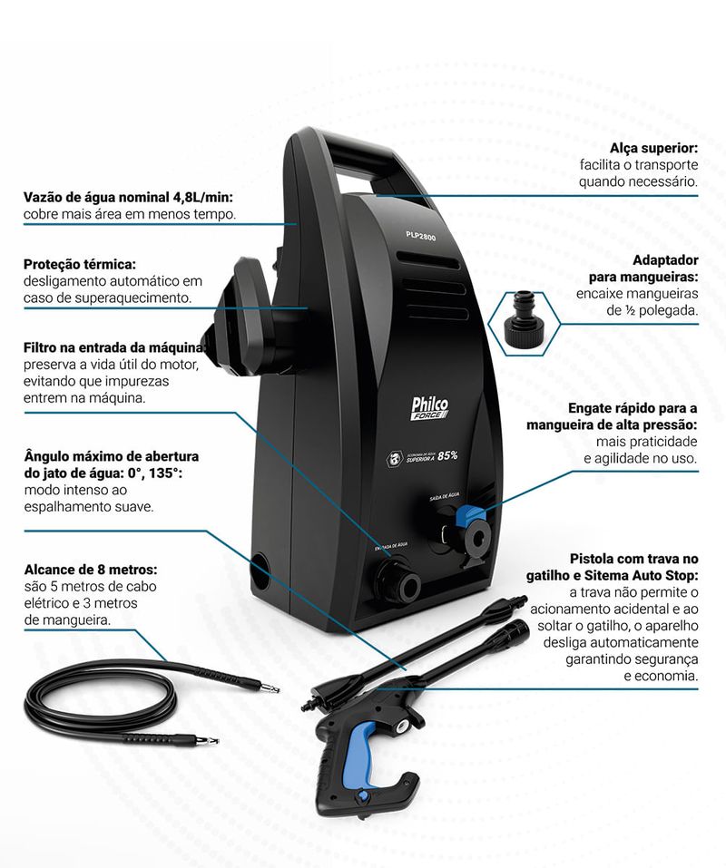 Imagine uma lavadora de alta pressão que transforma a limpeza em uma tarefa rápida, eficiente e até prazerosa. A Lavadora de Alta Pressão 1800psi Philco Force PLP2800 1600W chega para revolucionar seu dia a dia, com potência máxima de 1800psi e 1600W de desempenho, garante força e precisão para eliminar até as sujeiras mais resistentes. Com vazão de água de 4,8L por minuto, você cobre mais área em menos tempo, economizando até 85% de água. Praticidade é a palavra-chave: o gatilho com sistema auto stop interrompe o fluxo quando não está em uso, e o engate rápido da mangueira ½” facilita a instalação. Além disso, o filtro na entrada permite o uso de água de reuso, ou seja, protege o motor e prolonga a vida útil da máquina. Com proteção térmica e alça para transporte, a Lavadora de Alta Pressão Philco Force PLP2800 1600W é a solução completa para quem busca eficiência e conveniência. Não perca tempo com métodos ultrapassados. Escolha a Lavadora de Alta Pressão Philco e experimente a satisfação de ver resultados impecáveis em cada uso. Transforme sua rotina!• Potência nominal do motor 1600W• Pressão Nominal (PSI) 1200 PSI• Pressão Máxima (PSI) 1800 PSI• Pressão de entrada de água necessária 1MPa• Vazão de água nominal (l) 4,8L• Vazão de água máxima (l) 6,8L• Alcance total durante o uso (5m de cabo elétrico e 3m de mangueira = 8 metros)• Engate rápido para a mangueira• Gatilho com sistema auto stop • Ajuste de Spray/ Jato • Suporte para todos os acessórios • Ângulo de jato de água com ajuste de abertura de até Variação de 0 a 135°• Filtro na entrada da máquina• Alça para transporte • Adaptador para mangueira de 1/2" • Comprimento da mangueira de alta pressão (3m) • Protetor térmico (desliga o aparelho em casos de sobreaquecimento) • Economia de Água superior (85%)