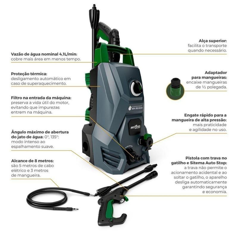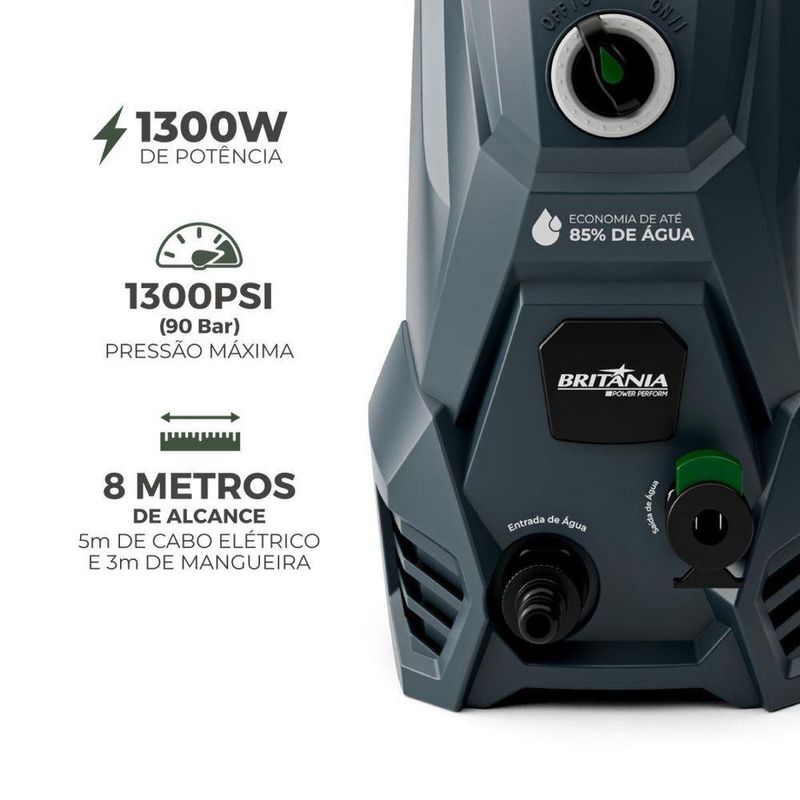 Lavadora De Alta Pressão Britânia 1300PSI 1300W BLPE2300 220VConheça a Lavadora de Alta Pressão Britânia 1300PSI 1300W BLPE2300 e transforme sua rotina de limpeza em um momento de satisfação.Imagine eliminar sujeiras difíceis sem esforço, deixando cada espaço da sua casa impecável.Com potência de 1300PSI e 1300W, você conquista um desempenho superior para limpar calçadas, carros e áreas externas com rapidez e eficiência.A vazão máxima de 5,2 l/h garante economia de água sem abrir mão da força.Sinta a tranquilidade de um equipamento seguro: proteção térmica, sistema Auto Stop e a trava no gatilho oferecem controle total.O prolongador para ponteira e alcance de 8 metros permitem chegar aos cantos mais difíceis sem complicação.Além disso, o suporte para mangueira e pistola mantém tudo organizado, trazendo praticidade ao seu dia.Não adie a experiência de uma limpeza completa e sem esforço. Adquira agora a Lavadora de Alta Pressão Britânia BLPE2300 e descubra como é fácil cuidar do seu lar com potência, economia e segurança.Principais CaracterísticasPotência nominal do motor: 1300WPressão Nominal (PSI): 60 Bar (870 Psi)Pressão Máxima (PSI): 90 Bar (1300 Psi)Pressão de entrada de água necessária: 1.0MPaVazão de água nominal: 4,1L/minVazão de água máxima: 5,2L/minAlcance total durante o uso: 5m de cabo elétrico + 3m de mangueira = 8 metrosEngate rápido para a mangueira Gatilho com sistema auto stopAjuste de Spray Suporte para todos os acessórios Ângulo de jato de água com ajuste de abertura de até: 135°Filtro na entrada da máquinaAlça para transporte Adaptador para mangueira de 1/2"Comprimento da mangueira de alta pressão: 3mProtetor térmico (desliga o aparelho em casos de sobreaquecimento)Economia de Água superior (85%) Gatilho com trava de acionamento.Observação: Somente faturamos para o nosso consumidor final, ou seja, não faturamos pedidos para CNPJ por este portal de vendas.Especificações TécnicasMarca: BritâniaModelo: BLPE2300Cor: PretoPotência (W): 1300WPotência nominal do motor: 1300WPressão Nominal (PSI): 60 Bar (870 Psi)Pressão Máxima (PSI): 90 Bar (1300 Psi)Pressão de entrada de água necessária: 1.0MPaVazão de água nominal: 4,1L/minVazão de água máxima: 5,2L/minEstado: NovoPSI: 1300Altura do produto: 42,7 cmLargura do produto: 23,3 cmComprimento do produto: 23,7 cmPeso do produto: 4,897 kgAltura com embalagem: 45 cmLargura com embalagem: 25,6 cmComprimento com embalagem: 24 cmPeso com embalagem: 5,537 kgGarantia (Dias): 360