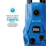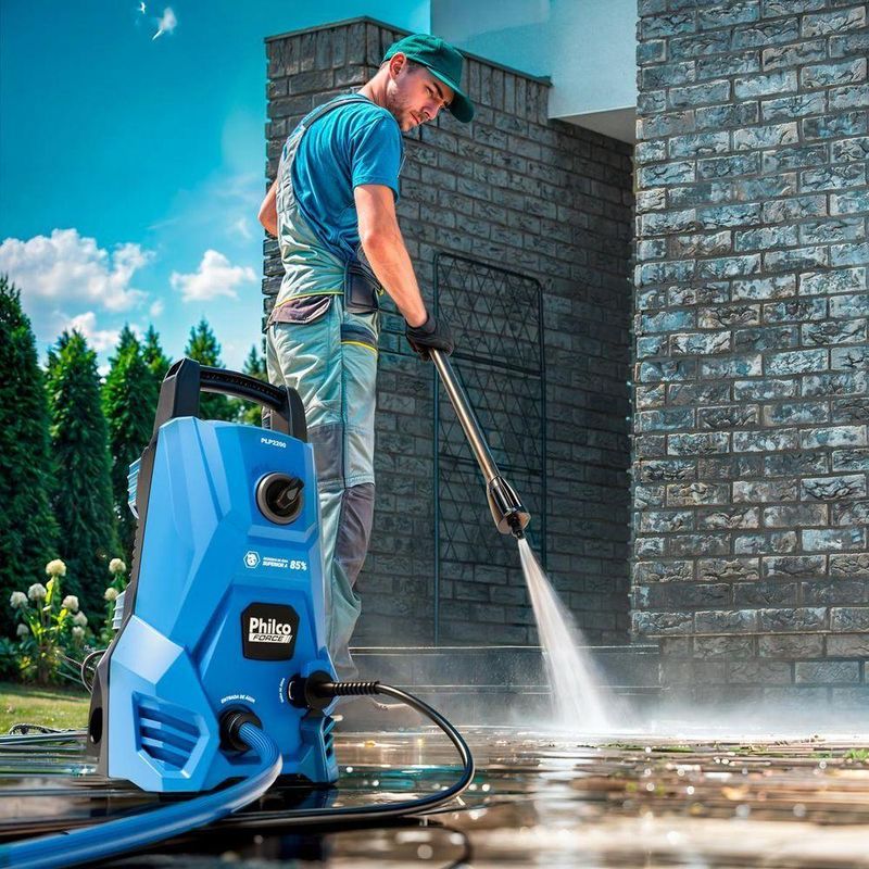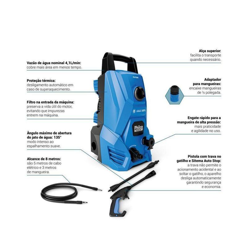 Lavadora de Alta Pressão Philco Force 1300psi 1300W PLP2200 220VSimplifique a limpeza de áreas externas e conquiste mais tempo para o que realmente importa com a Lavadora de Alta Pressão Philco Force 1300W PLP2200. Seu motor de 1300W e a pressão máxima de 1300psi asseguram uma higienização profunda, ideal para remover sujeiras difíceis em pisos, muros, carros e calçadas, sem esforço.Com vazão de água de até 5,2L/min e economia superior a 85% no consumo de água, a Lavadora de Alta Pressão Philco alia potência à responsabilidade ambiental. O longo alcance de 8 metros, somando cabo elétrico de 5m e mangueira de 3m, amplia sua mobilidade para alcançar todos os cantos da casa ou do negócio.A segurança também é prioridade. O gatilho com sistema Auto Stop evita desperdício de energia e água, enquanto a trava de segurança previne acionamentos acidentais. O protetor térmico cuida da Lavadora de Alta Pressão PLP2200, desligando-a automaticamente em caso de superaquecimento.A Lavadora de Alta Pressão Philco conta ainda com acessórios práticos, como pistola, lança, filtro lavável, engate rápido e suporte para armazenamento traseiro, além do prolongador de ponteira que facilita o acesso a locais mais altos. Com a Lavadora de Alta Pressão Philco 1300W PLP2200, você transforma o cuidado com o lar em uma experiência mais ágil, segura e eficiente.Potência nominal do motor: 1300WPressão Nominal: 60 Bar (870Psi)Pressão Máxima: 90 Bar (1300Psi)Pressão de entrada de água necessária: 1MpaVazão de água nominal: 4,1L/min Vazão de água máxima: 5,2L/minAlcance total durante o uso: 8 metrosEngate rápido para a mangueiraGatilho com sistema auto stopAjuste de Spray/Jato: 0 a 135°Suporte para todos os acessóriosÂngulo de jato de água com ajuste de abertura de até 135°Filtro na entrada da máquinaAlça para transporteAdaptador para mangueira de 1/2""Comprimento da mangueira de alta pressão: 3mProtetor térmicoEconomia de Água superior (85%)Gatilho com trava de segurança.Especificações Técnicas:Marca: PhilcoModelo: PLP200Cor: AzulEstado: NovoPSI: 1300Potência (W): 1300WAltura do produto: 43,7 cmLargura do produto: 23,5 cmComprimento do produto: 23,5 cmPeso do produto: 4,894 kgAltura com embalagem: 45 cmLargura com embalagem: 25,6 cmComprimento com embalagem: 24,2 cmPeso com embalagem: 5,469 kgGarantia (Dias): 360Observação: Somente faturamos para o nosso consumidor final, ou seja, não faturamos pedidos para CNPJ por este portal de vendas;