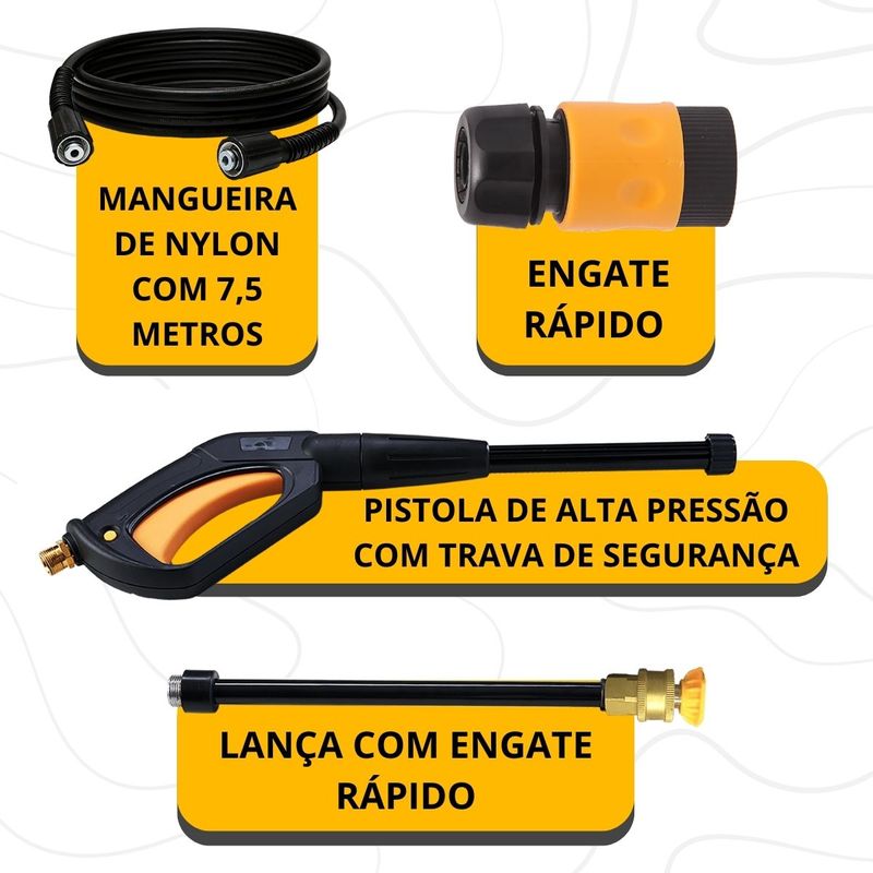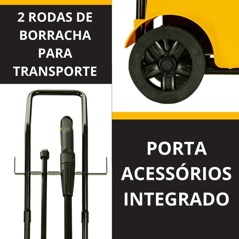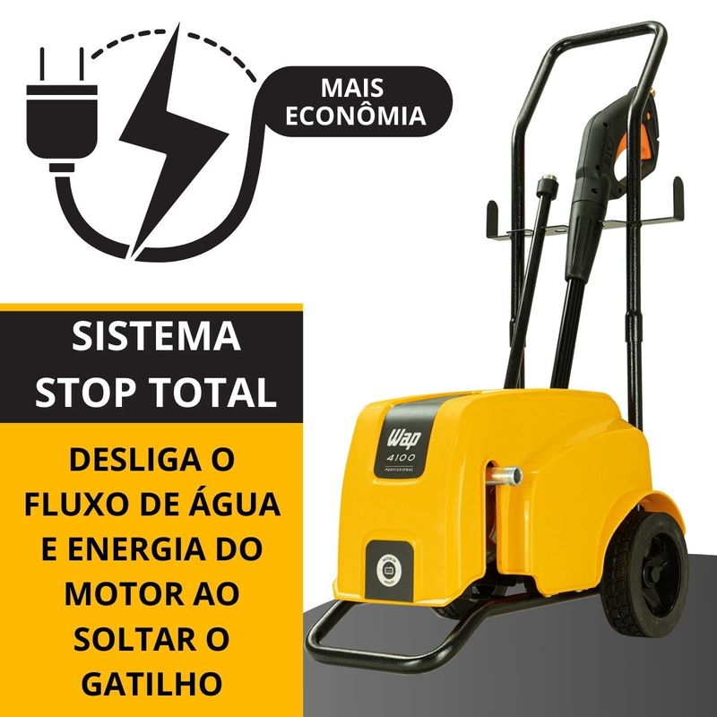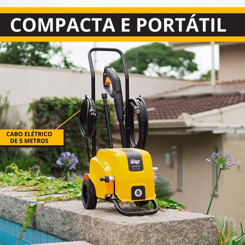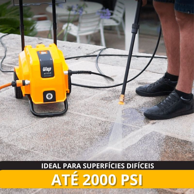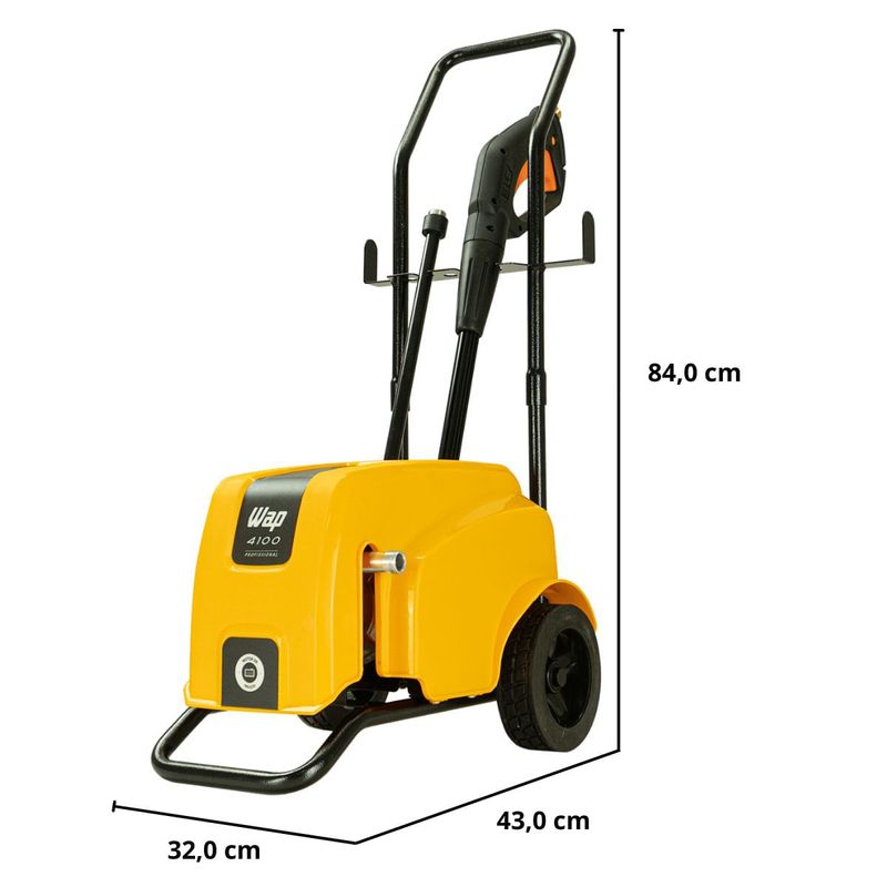 Conteúdo da embalagem:01 Máquina Lavadora01 Manual 01 Agulha de limpeza para o bico01 Pistola de alta pressão com trava de segurança01 Lança com engate rápido01 Bico leque 15°01 Mangueira de alta pressão de nylon com 7,5 metros01 Engate rápidoComponentes:- Bomba axial com cabeçote de alumínio- Pistões em aço inox; Cabo elétrico de 5 metros- Suporte para acessórios- 2 Rodas de borracha para transporte- Alça removível para transporte- Sistema Stop TotalAtributos e Benefícios:- Potência de 2200W e Pressão Máxima de 2000 PSI: Proporciona excelente desempenho para remoção de sujeiras profundas, ideal para superfícies difíceis como pisos de grande fluxo e áreas de difícil acesso.- Vazão Máxima de 500 L/h: Permite um alto volume de água por hora, garantindo eficiência na limpeza de grandes áreas em pouco tempo.- Motor de Indução: Oferece maior durabilidade, menos necessidade de manutenção e maior eficiência na limpeza, garantindo uma máquina de longa vida útil.- Compacta e Portátil: Apesar de sua alta potência, a WAP 4100 é de fácil transporte e armazenamento, podendo ser transportada na caixa de transporte de motocicletas.- Porta Acessórios Integrado: Organiza todos os acessórios de forma prática, facilitando o manuseio e transporte de peças importantes como bicos e mangueiras.- Rodas Emborrachadas e Antiderrapantes: Facilita o transporte sem danificar o piso, tornando o processo de movimentação da lavadora mais prático e seguro.- Bomba Axial com Cabeçote de Alumínio e Pistões de Aço Inox: A bomba robusta oferece resistência e longa vida útil, sendo capaz de suportar o uso frequente sem comprometer o desempenho.- Mangueira de Alta Pressão de 7,5 metros: Permite alcançar uma grande área de limpeza sem a necessidade de mover constantemente a máquina.- Cabo Elétrico de 5 metros: Facilita o alcance em áreas mais amplas sem necessidade de extensões adicionais.- Trava de Segurança na Pistola: Oferece mais segurança durante o uso, prevenindo acidentes e permitindo que a máquina seja desligada quando não estiver em uso.- Bico Leque 15º: Garantia de um jato de água eficiente e ajustável, adequado para diferentes tipos de limpeza.- Sistema Stop Total: Desliga automaticamente o fluxo de água e energia do motor ao soltar o gatilho, poupando energia e aumentando a vida útil da lavadora.- Ideal para Uso Comercial: Perfeita para pequenos negócios como lava carros, mercadinhos, restaurantes, açougues e até em condomínios, oferecendo um desempenho confiável e duradouro.Especificações Técnicas:- Cor: Amarelo com Preto- Motor: Indução- Voltagem: 127V ou 220V (escolher no momento da compra)- Pressão máxima: 1650 PSI (127V) / 2000 PSI (220V)- Corrente elétrica / Amperagem: 20 A- Potência elétrica: 1500W (2 CV) (127V) / 2200W (3 CV) (220V)- Comprimento da mangueira: 7,5 m- Tipo da mangueira: Mangueira de nylon- Tipo de plugue: 3 pinos- Vazão: 420 L/h (127V) / 500 L/h (220V)- Comprimento cabo elétrico: 5 m- Tipo de sujeira: Moderada/Incrustada- Classe de isolação: I- Frequência: 60 HzDimensões da caixa: (C x L x A)47,6 x 32,8 x 43,5 cmPeso bruto: 18 kgDimensões do produto (C x L x A)43 x 32 x 84 cmPeso líquido: 15,3 kgGarantia: - 01 Ano (3 meses de garantia legal e mais 9 meses de garantia especial concedida pela WAP)A lavadora de alta pressão WAP 4100 é a melhor opção para limpar sujeiras pesadas e profundas de grandes áreas com rapidez e agilidade. Com motor de indução, vazão máxima de até 500 L/h, potência de até 2200W e pressão máxima de até 2000 PSI, é o equipamento de uso frequente perfeito para a remoção de níveis incrustados de sujeira nos mais diversos tipos de pisos e superfícies. É uma máquina compacta, durável, robusta e super prática para transportar. Ela cabe, inclusive, na caixa de transporte de motocicletas. Possui um exclusivo porta-acessórios que ajuda na organização dos componentes do produto e rodas emborrachadas, antiderrapantes, que não riscam o piso e facilitam o transporte.