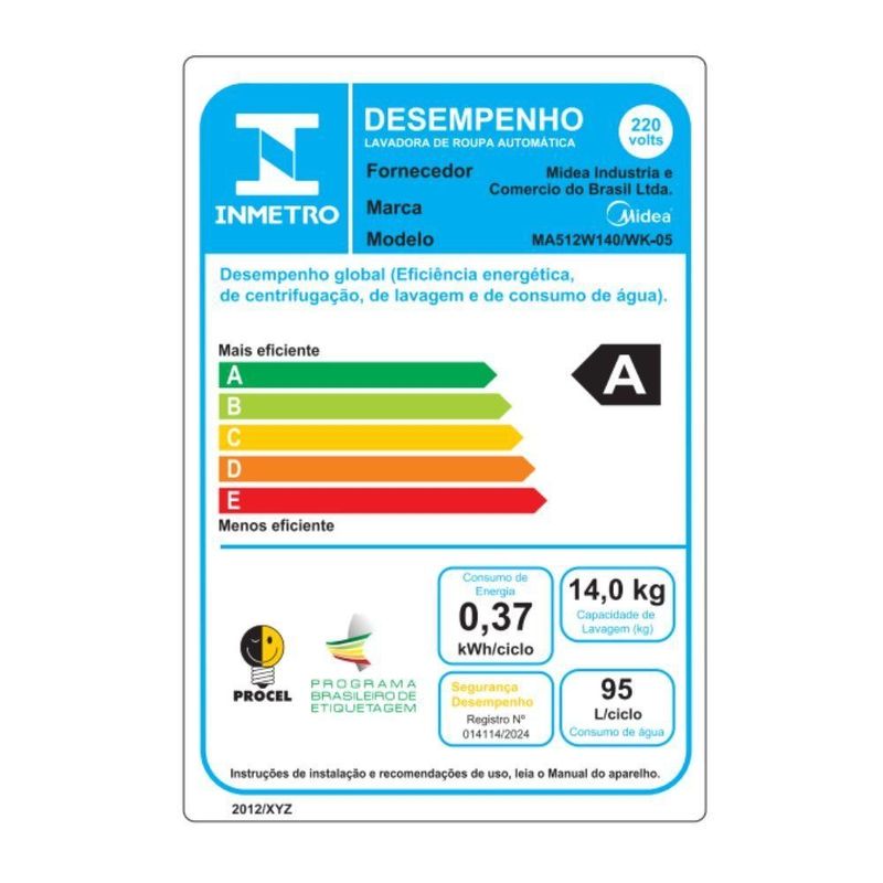 Lavadora de Roupas Midea 14Kg Wave Impeller - Grande capacidade e múltiplos programas para cuidado completo com as roupasA Máquina de Lavar Roupas Midea Wave Impeller 14kg oferece amplo espaço interno e recursos que facilitam o dia a dia. Com eficiência energética A e consumo aproximado de 0,37 kWh por ciclo, alta economia e bom desempenho.Possui 13 programas de lavagem, incluindo opções para roupas brancas, coloridas, delicadas, edredom e tênis, além de funções como avançar etapa, ajuste de nível de sujeira, TURBO, reuso de água e perfume+. Conta ainda com centrifugação a 750 rpm e diferentes níveis de água para adaptar o processo às necessidades de cada carga.O cesto em aço inox garante durabilidade, enquanto o filtro de fiapos contribui para melhores resultados de limpeza. A trava de segurança e a função silenciar aumentam o conforto e a segurança no uso. O dreno automático facilita a operação e o painel de controle é de fácil manuseio.Eficiência, capacidade e versatilidade para lavar mais em menos tempo.Especificações TécnicasMarca: MideaModelo: Wave ImpellerVoltagem: 220VCor: BrancaCapacidade de Lavagem: 14kgEficiência Energética: AConsumo de Energia Aproximado: 0,37kWh/cicloVelocidade de Centrifugação: 750 rpmPotência sonora de lavagem (Nível de Ruído): 64 dB(A)Potência sonora de centrifugação (Nível de Ruído): 78 dB(A)Programas de Lavagem/Secagem: Brancas, Coloridas, Rápido 20’, Algodão, Sintético, Super ECO, Tênis, Delicado/lã, Cama e banho, Edredom, Jeans, Tira-manchas, Limpeza do tambor Funções: Avançar etapa, Nível de sujeira, TURBO, Nível de água, Perfume+, Reuso de água, Enxágue+, Centrifugação+, Silenciar, Travar Painel de Controle Trava de Segurança: SimFiltro de Fiapos: SimMaterial do Cesto: Aço InoxRodízios para Transporte: NãoDreno Automático: SimDimensões do Produto Embalado: 65 L x 107,1 A x 66,4 P cmPeso Bruto: 46 kgDimensões: 58 L x 101,5 A x 57 P cm Altura com porta aberta: 138 cmPeso Liquido: 43kgGarantia: 24 meses