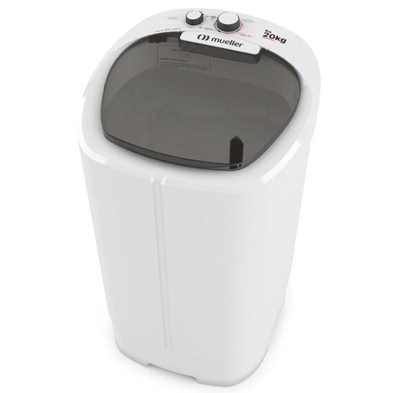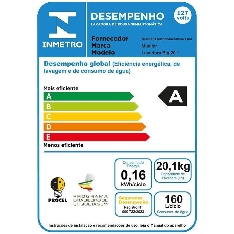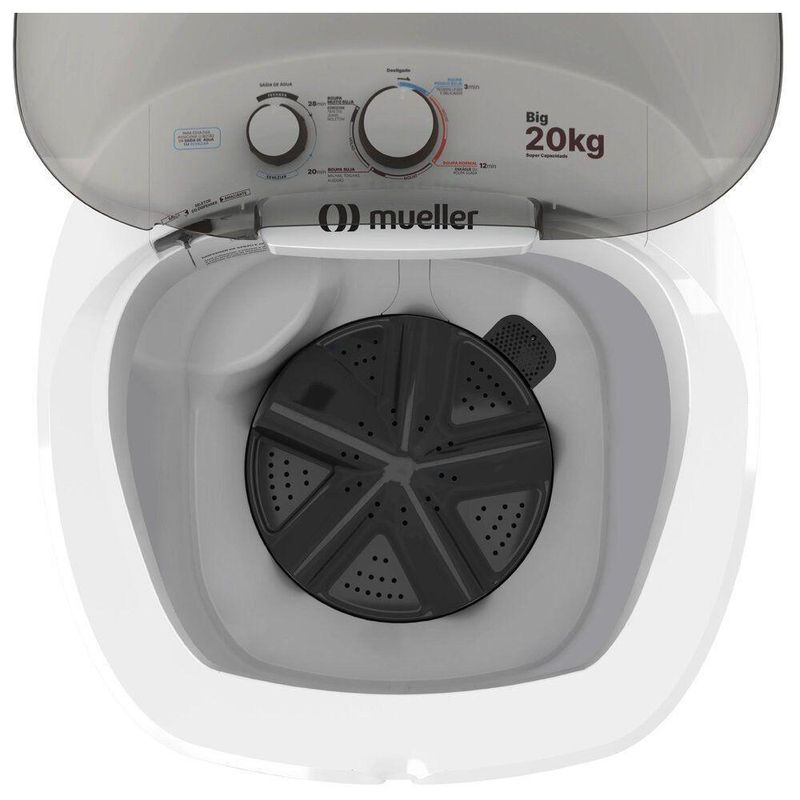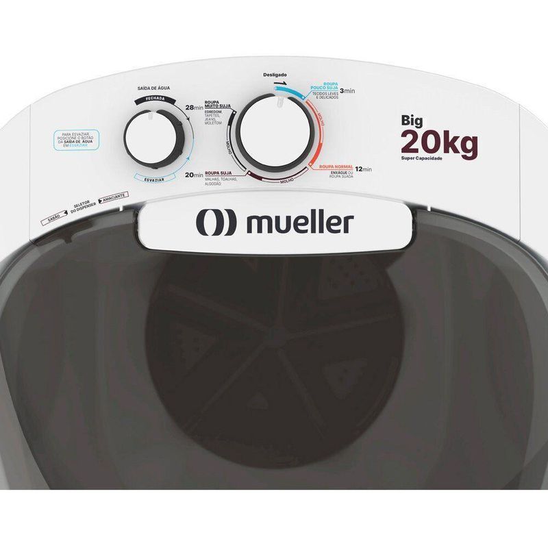 Lavadora De Roupas Semiautomática 20,1kg Mueller Big Branco 110VA Lavadora de Roupas Semiautomatica 20,1Kg Mueller Big, Branca conta com 1 dispenser para sabao, 1 dispenser para amaciante, 4 programas de lavagem (3 min / 12 min / 20 min / 28 min), saida de agua, 3 modos molho, sistema de drenagem, timer de ate 28 minutos, filtro de fiapos e ainda desligamento automatico.Caracteristicas: Marca: Mueller Modelo: Big Material: Polipropileno Dispenser: Sim Tipo: Semiautomatica Capacidade de roupas secas: 20,1 kg Capacidade de agua na cuba: 112 litros Programas de lavagem: 4 Nao possui programa de centrifugacao Sistema de lavagem: Turbilhonamento Sistema de drenagem: Sim Niveis de agua: Nao possui Timer: Sim, de 0 a 28 minutos Molho: Sim, tres tipos de molho Desligamento automatico: Sim Potencia: 390W / 420W Consumo de energia: 0,18 kW/h Saida de agua: Sim Filtro: Filtro de fiapos: Coluna d`agua (plastico parede todos os niveis de agua) Dimensoes: Altura: 96,00 cm Largura: 57,00 cm Profundidade: 58,00 cm Peso: 11,82 kg Garantia do fornecedor: 3 Meses