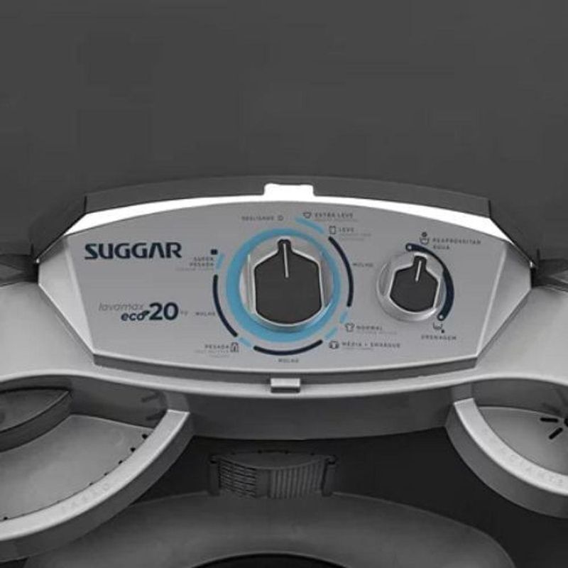 Lavadora De Roupas Suggar Eco 20kg Prata 110v Le2001prA Lavadora de Roupas Suggar Eco 20Kg Prata 110V LE2001PR semiautomática chegou para agilizar a seu dia a dia! Com capacidade para lavar até 20kg de roupas, incluindo edredom de casal tamanho King, e sistema de drenagem, é a maior máquina de lavar roupas da categoria. Além disso, ela possui função reaproveitar água, 1 dispenser para sabão e outro para amaciante, 3 níveis de água e filtro cata-fiapos, 3 molhos, desligamento automático, timer com programação e 6 programas de lavagem. Tudo isso com um baixo consumo de energia.