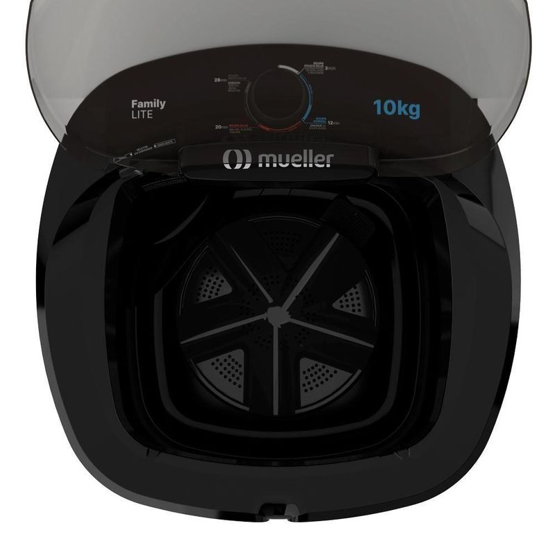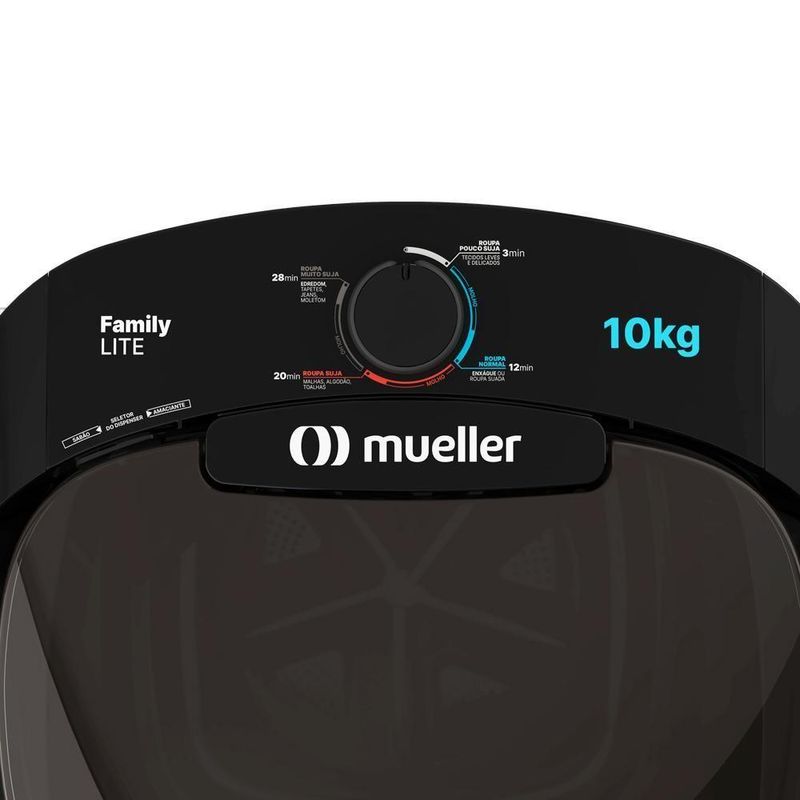 Lavadora Semiautomática Mueller Family Lite 10kg Preta 127VCom capacidade para até 10 kg de roupa, A Family Lite lava, enxágua, mas não centrifuga.Ela possui o exclusivo Family Filter: filtro de fiapos por coluna d’água que elimina os indesejáveis fiapos que ficam nas roupas em qualquer nível de água.Conta com dispenser para sabão e amaciante com medidor e seletor. Esse dispenser permite que o amaciante seja despejado no momento certo da lavagem.O timer da Family Lite possui 6 programas com indicações do tempo de lavagem e as peças ideais para cada processo.E se tratando de economia ela recebeu classificação “A” pelo INMETRO, comprovando sua grande eficiência e economia.Programas: Roupa muito suja: Lavagem de edredom 28min, Lavagem super pesada 26min, Molho; Roupa normal: Lavagem pesada 20min, Molho; Roupa pouco suja: Lavagem rápida ou enxágue 12min, Lavagem delicada 9min, Molho, Lavagem curta 3min. Especificações Técnicas:Marca: MuellerVoltagem: 127VModelo: Lavadora Family Lite 10Kg PretaCor: PretoTipo: Semi-automáticoAbertura: SuperiorNúmero de Programas: 6Tipo de Controles: MecânicoTipo de Tela: Botão de acionamento manualGabinete: Plástico especialSistema de Lavagem: TurbilhonamentoAltura: 96 cmLargura: 54,5 cmProfundidade: 54,5 cmPeso: 11 kgCapacidade de Lavagem: 10 kgCapacidade de Água na Cuba (nível máximo): 96 litrosConsumo de Energia (ciclo normal água fria): 0,08 kW/hPotência 127V: 330 WattsPotência 220V: 335 WattsConsumo de Água por Ciclo: 133 litrosEntrada de Água: ManualSaída de Água: ManualEnxágue: ManualCom rotação: NãoCapacidade de Secagem: Não aplicávelImportante: Certifique-se de selecionar a voltagem com as tomadas da sua residência, caso a voltagem escolhida na finalização do pedido estiver incorreta o produto não funcionará.A Lavadora Family sai da fábrica desmontada, mas não se preocupe: a montagem é muito simples. Basta seguir as orientações do passo a passo contidas na caixa do produto.