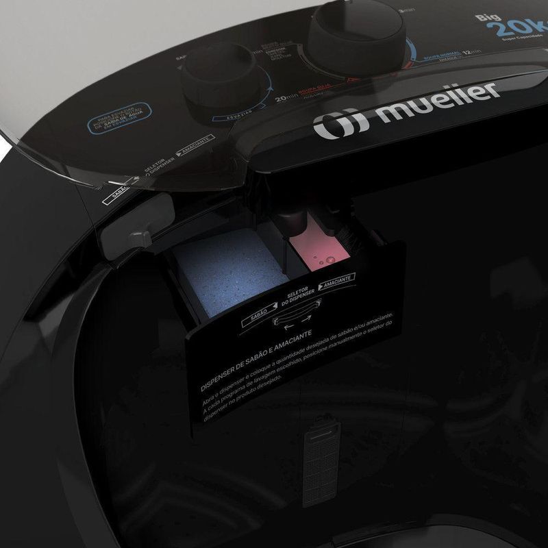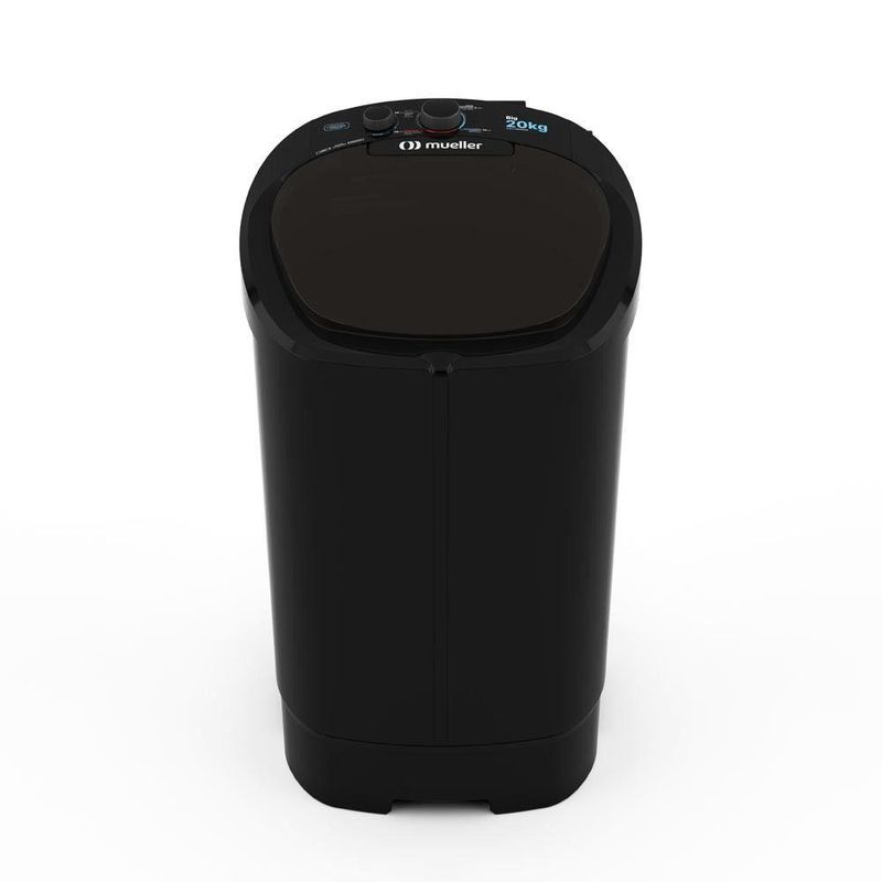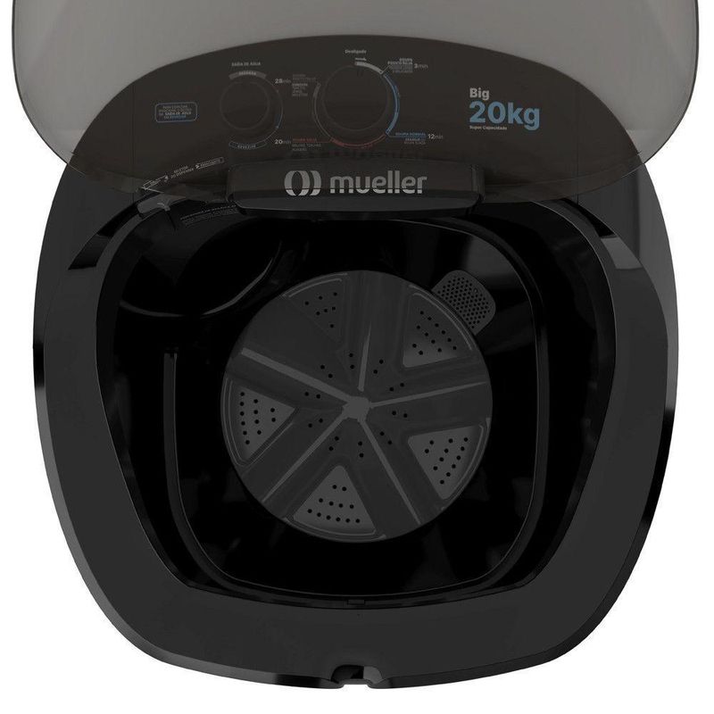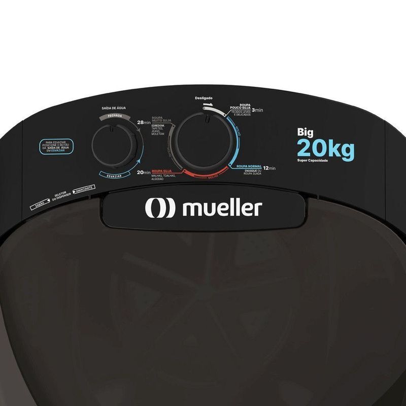 Lavadora Semiautomática Tanquinho Mueller 20kg Big Preto 220 VA Lavadora Semiautomatica Big 20Kg e ideal para que busca alta capacidade de lavagem. Ela e uma lavadora semiautomatica. Possui sistema de drenagem no painel, onde voce controla a saida de agua pelo botao localizado no painel. Conta com filtro para fiapos por coluna dagua garantindo que toda a agua no processo de lavagem passe pelo filtro, eliminando os indesejaveis fiapos. No fundo da cuba possui uma peneira para pequenos objetos, garantindo que nenhum objeto fique preso no batedor.MODELO: 6100006 Possui dispenser para sabao e amaciante com medidor e seletor Ciclo lavagem de edredom Dimensoes do produto: Altura: 96 cm Largura: 57 cm Profundidade: 58 cm Peso: 11,83 kg Garantia: 12 meses