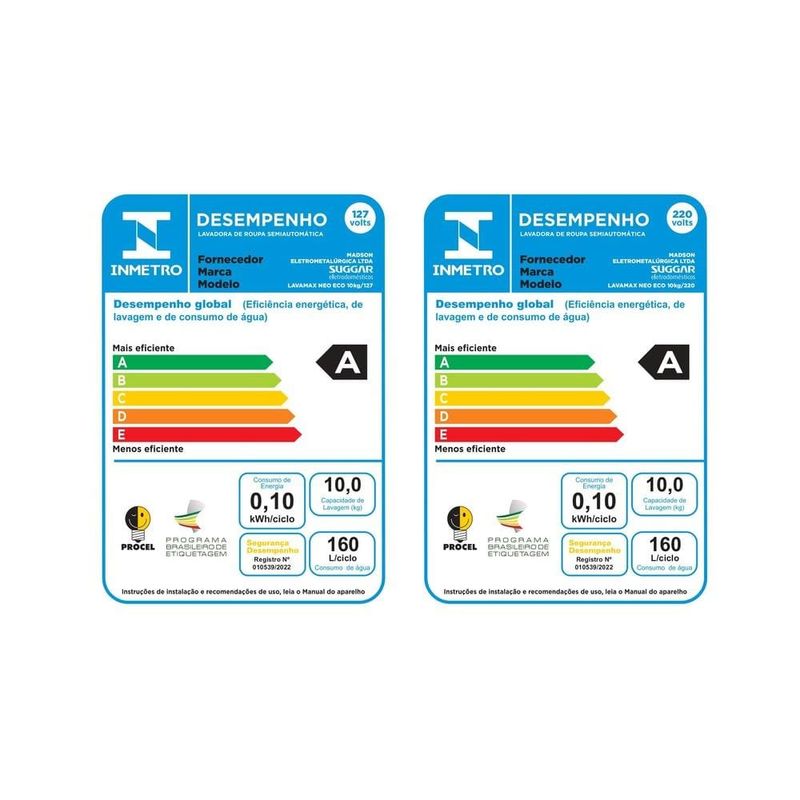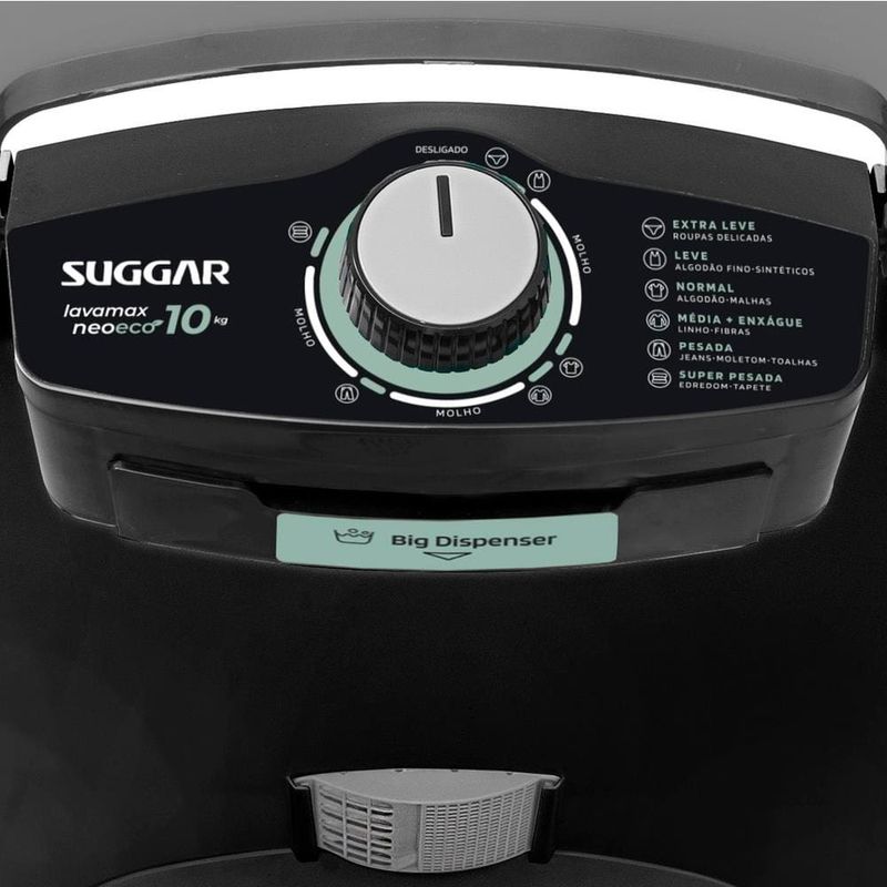 Tenha mais praticidade e economia no dia a dia com o Lavadora Suggar Neo Eco 10kg Preto, um produto compacto e eficiente. Com capacidade para até 10kg de roupas, conta com batedor exclusivo de alto desempenho que proporciona uma lavagem mais potente, preservando os tecidos. O dispenser de gaveta para sabão oferece praticidade no uso diário, enquanto o filtro cata-fiapos ajuda a manter as roupas mais limpas. O Tanquinho Suggar possui 6 programas de lavagem e 3 opções de molho, com timer programável de até 28 minutos e desligamento automático. Lava até 10kg de roupas com eficiência 6 programas de lavagem + 3 molhos Filtro cata-fiapos e dispenser para sabão de gaveta Timer ajustável de 0 a 28 minutos com desligamento automático Classificação energética A com consumo de apenas 0,10kWh por ciclo Classificação energética A e baixo consumo de energia (apenas 0,10kWh por ciclo) completam seu excelente desempenho.