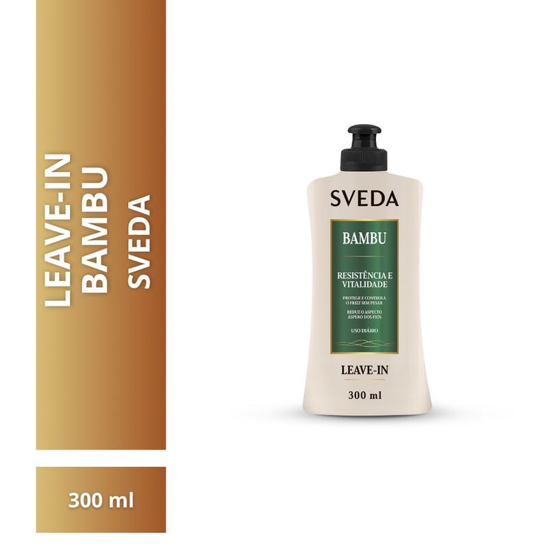 Leave-In Sveda Hair Bambu Resistência e Vitalidade 300ml O Leave-In Sveda Hair Bambu Resistência e Vitalidade 300ml é o cuidado diário ideal para quem busca cabelos mais fortes, macios e resistentes à quebra, com tratamento capilar seguro e eficaz. Com ativos reconhecidos por sua ação fortalecedora, sua fórmula ajuda a reduzir o aspecto áspero dos fios, promovendo vitalidade, flexibilidade e proteção contínua ao longo do dia. Um leave-in versátil que trata, protege e facilita a rotina de cuidados capilares sem pesar. Principais benefícios Resistência e vitalidade desde a primeira aplicação Fortalece os fios e melhora a saúde capilar. Reduz o aspecto áspero dos cabelos Toque mais macio e fios visivelmente mais alinhados. Ação antiquebra Ajuda a prevenir danos causados por escovação, calor e agressões externas. Cabelos mais fortes e flexíveis Ideal para fios fragilizados ou quebradiços. Fácil aplicação e uso diário Não pesa e não deixa resíduos. Embalagem prática de 300ml Ótimo rendimento e excelente custo-benefício. Indicado para Cabelos frágeis, opacos ou com quebra Fios ressecados e com textura áspera Rotina de tratamento capilar seguro Modo de uso Aplique uma pequena quantidade do Leave-In Sveda Hair Bambu Resistência e Vitalidade nos cabelos úmidos ou secos, do comprimento às pontas. Não enxágue. Finalize como desejar.