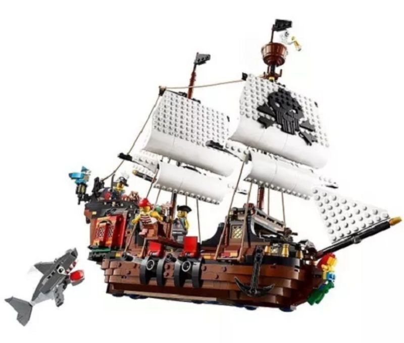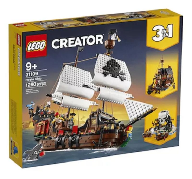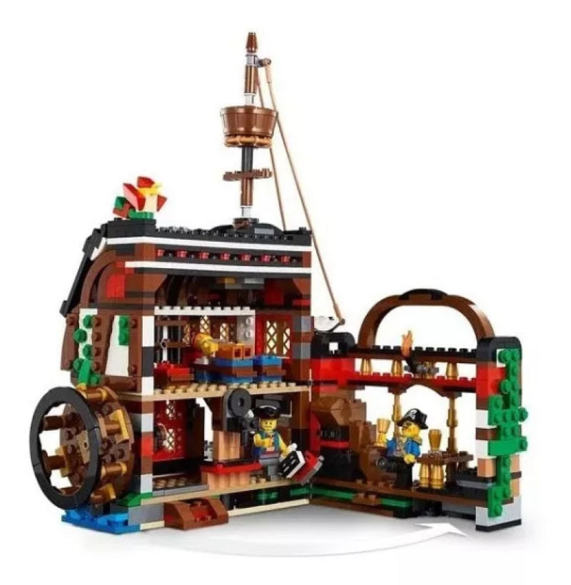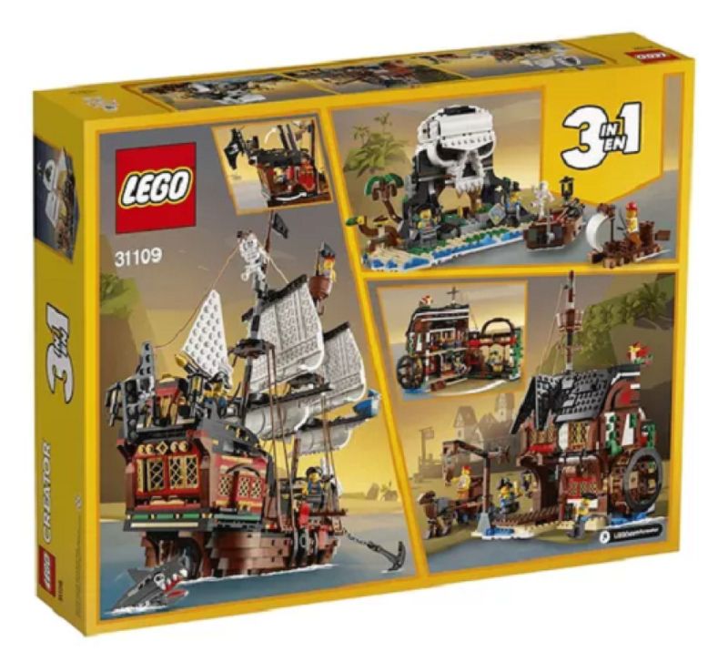Lego 31109 Creator 3 em 1 Navio Pirata Ilha Caveira Taverna - 1260 Peças Os altos mares estão chamando! Aventuras e lutas de espada aguardam os fãs de piratas no brinquedo LEGO® Creator Barco Pirata 3-em-1 (31109). Este fantástico conjunto detalhado contém um barco de pirata com velas móveis, canhões e uma cabine com teto e laterais que abrem, 3 minifiguras. Assim, são possíveis pelo menos 3 diferentes experiências para construir e jogar com este conjunto de brinquedo 3-em-1 LEGO Creator. As crianças podem construir um Barco Pirata, e depois reconstruir e convertê-lo em uma Estalagem de Piratas ou em uma assustadora Ilha da Caveira. Ou podem dar asas à sua criatividade e conceber algo novo. • O conjunto LEGO® Creator Barco Pirata 3-em-1 (31109) encoraja o jogo criativo das crianças, contém 3 modelos em 1: Um Barco Pirata clássico, Estalagem de Piratas rústica e uma misteriosa Ilha da Caveira. Construir e reconstruir mantém o jogo em movimento. • Um barco pirata aberto a oportunidades! As crianças podem aumentar as suas habilidades de construção e criatividade com o super detalhado brinquedo Barco Pirata, visitar a Estalagem dos Piratas para comer, explorar a Ilha da Caveira ou criar um modelo totalmente novo. • Este conjunto dá 3 opções de construção: Um Barco Pirata 3-em-1 LEGO® Creator (31109), Estalagem de Piratas ou Ilha da Caveira para brincar só com este jogo ou combinar com outros conjuntos. O conjunto também tem 3 minifiguras para possibilidades adicionais de jogo. • Qualquer fã de jogo e construção criativos vai adorar este fabuloso conjunto. Os modelos realistas Barco Pirata, Estalagem de Piratas e Ilha da Caveira funcionam como excelentes presentes de Natal, aniversário ou férias para meninos e meninas a partir dos 9 anos. • Os altos mares estão chamando! O barco pirata mede mais de 37 cm de altura, 46 cm de comprimento e 19 cm de largura, o que significa que este brinquedo emocionante está cheio de espantosos detalhes e é suficientemente grande para enorme diversão quer seja jogando sozinho ou em grupo. • Funciona com a imaginação de uma criança durante horas de diversão interminável! Idade acima de 9 anos Contem 1260 peças Tamanho da embalagem 48 x 38x 9 cm Fabricante Lego