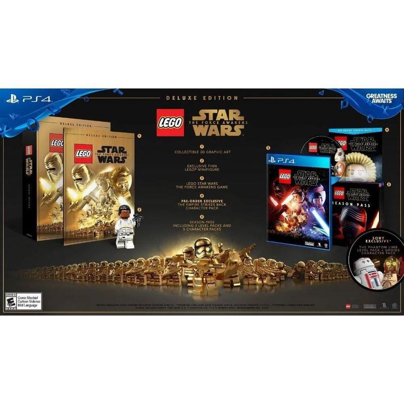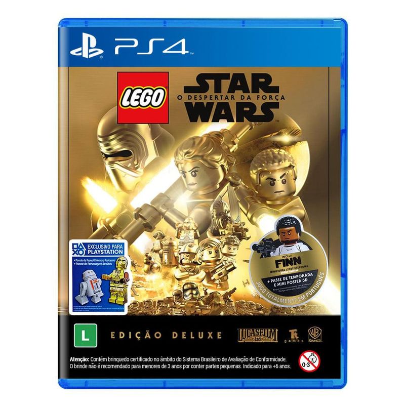 A franquia de jogos de número 1 de LEGO® retorna triunfante com uma divertida e bem humorada jornada baseada no filme de sucesso de Star Wars. Em LEGO Star Wars: The Force Awakens, os jogadores revivem a ação épica do filme de sucesso Star Wars: O Despertar da Força, recontada através da esperta e engenhosa lente da LEGO. O jogo também traz um novo conteúdo jogável que explora o tempo entre Star Wars: O Retorno de Jedi e Star Wars: O Despertar da Força. A Edição Deluxe inclui: Minifigura Lego Finn Exclusiva + Passe de temporada e mini poster 3D. Características: • Desenvolvedor: TT Games • Distribuidora: Warner Games • Título: Lego Star Wars: O Despertar da Força Edição Deluxe • Ano de lançamento: 2016 • Plataforma: PS4 • Gênero: Ação e Aventura • Espaço Necessário: No mínimo 15 GB • Jogadores: 1-2 Jogadores • Jogadores Online: Não • Áudio: Português • Legendas: Português • Classificação Indicativa: Livre para todos os públicos • Garantia do Fornecedor: 3 meses contra defeitos de fabricação Itens inclusos: • 1 Jogo de Videogame Peso e Dimensões Aproximadas do produto na caixa: • Largura: 19 cm. Altura: 14 cm. Profundidade: 3 cm. • Peso: 160 g *Só comercializamos produtos novos, originais e lacrados em caixa. *As cores podem variar entre as imagens mostradas acima e o produto. Imagens meramente ilustrativas. *Em casos de arrependimento de compra, a restituição do valor pago só será possível mediante a devolução da peça em seu case original, com a embalagem plástica externa devidamente lacrada, com todos os selos/lacres intactos, não devendo apresentar qualquer indício de manipulação e/ou utilização!