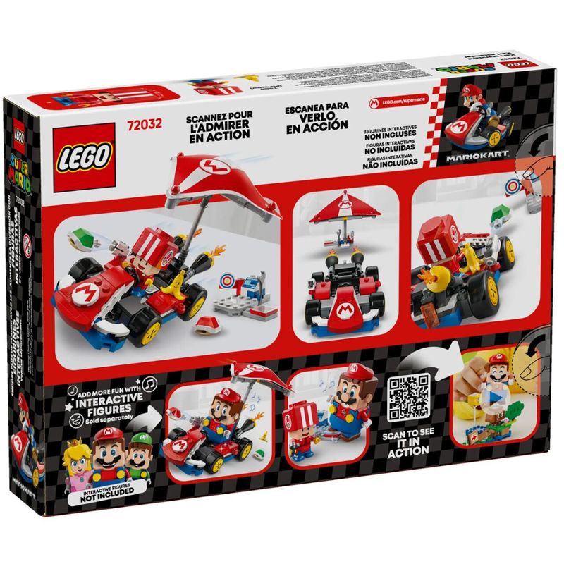 Aviso: Figura do Mario não inclusa ( vendida separadamente ). Imagens meramente ilustrativas!! O conjunto inclui um modelo montável do Standard Kart de Mario Kart, uma estação de trabalho com um alvo e uma figura de brinquedo Toad (Pit Crew) em uniforme vermelho de equipe de pit. O Standard Kart apresenta um Super Glider destacável, rodas que permitem drifting e uma função de lançamento para disparar projéteis no alvo da estação de trabalho. O Kart Padrão apresenta um Super Planador destacável, rodas que permitem derrapar e uma função de lançamento para disparar projéteis no alvo da estação de trabalho. Medidas: O veículo de brinquedo Mario Kart neste conjunto de 174 peças mede mais de 4 cm de altura, 14 cm de comprimento e 8 cm de largura. Dê este conjunto para meninos, meninas e jogadores com 7 anos ou mais; um dos conjuntos 71439, 71440 ou 71441 (vendido separadamente) é necessário para jogo interativo.