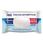 Toalha Umedecida Mili Antisséptica 50 unidades Medida de cada toalha: 20 cm x 13 cm Embalagem com 50 unidades Segurança e praticidade em qualquer lugar Contém Clorexidina, uma susbtância que elimina 99,9% das batérias, substiuindo o alcool 70% na limpeza das mãos, corpo e de superfícies em geral. Substitui o álcool 70% Efeito hidratante, não resseca a pele. Suave fragância de erva-doce