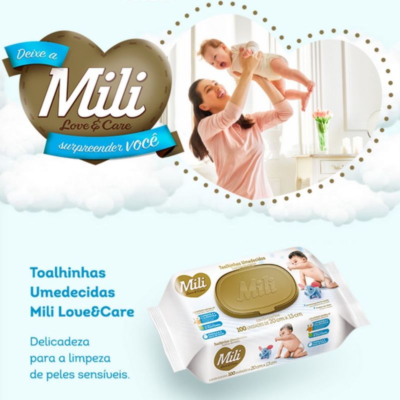 Toalhinhas Umedecidas Love & Care Quantidade: 5 Pacotes com 100 unidades (total: 500) Marca: MILI Medida: 20cm x 13cm Delicadeza para a limpeza de peles sensíveis Faça a limpeza do seu bebê com a delicadeza, proteção e suavidade da linha de toalhinhas umedecidas premium da Mili Love & Care. Um produto não oleoso, com D-Pantenol e textura que proporciona a higiene com menos assaduras. - Dermatologicamente testado - Extrato natural de Camomila e Calêndula - Fórmula a base de água