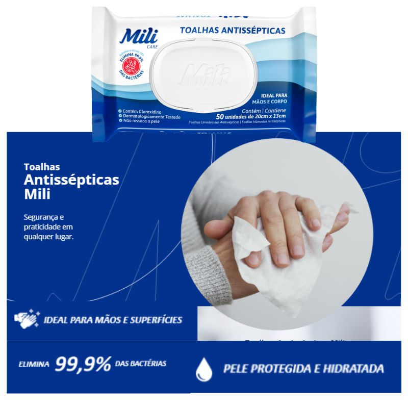 Toalhas Umedecidas Mili Antissépticas Embalagem com 24 pacotes de 50 unidades, totalizando 1200 toalhas Experimente a praticidade aliada à segurança com as Toalhas Umedecidas Mili Antissépticas. Cada embalagem contém 50 unidades, com medidas de 20 cm x 13 cm, proporcionando limpeza eficaz em qualquer lugar. Principais Benefícios: • Eliminação de 99,9% das bactérias: Enriquecidas com Clorexidina, nossas toalhas substituem o álcool 70% na limpeza de mãos, corpo e superfícies, oferecendo proteção máxima. • Segurança e Praticidade: Embalagem com 24 pacotes de 50 unidades, totalizando 500 toalhas, para garantir que você esteja sempre preparado. • Efeito Hidratante: Diferente de muitos produtos, nossas toalhas proporcionam limpeza sem ressecar a pele, mantendo-a suave e hidratada. • Aroma Agradável de Erva-Doce: Desfrute de uma suave fragrância de erva-doce durante o uso, tornando a experiência ainda mais agradável. As Toalhas Umedecidas Mili Antissépticas são a escolha perfeita para uma higiene completa e conveniente. Substitua o álcool 70% com confiança e cuide da sua pele com a eficácia que você merece.