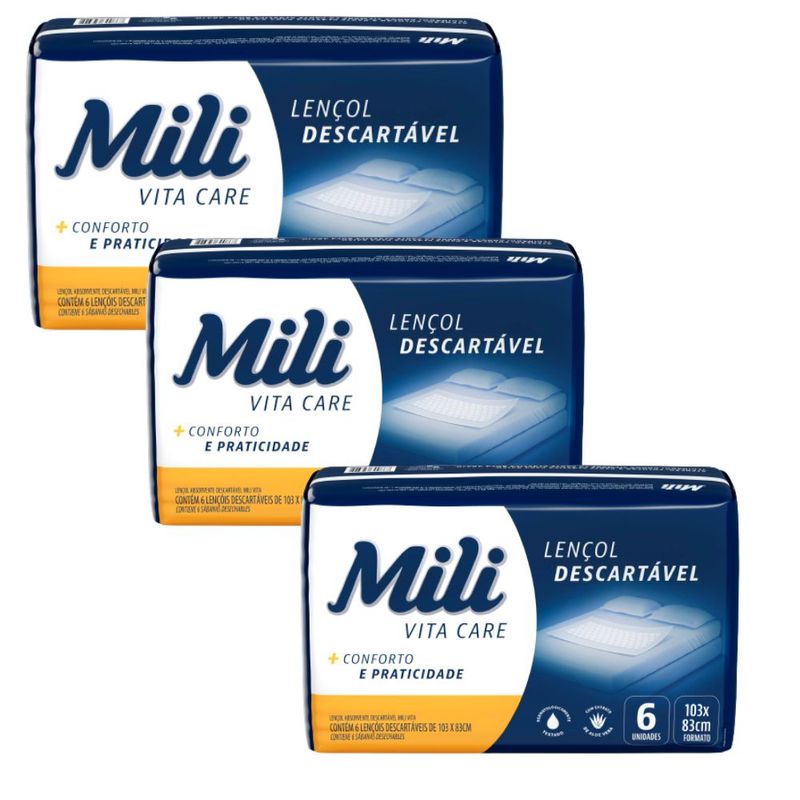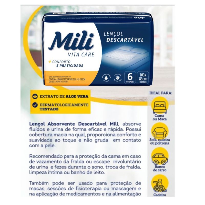 Lençol Descartável Absorvente Mili Vita Medida de cada lençol: 103 x 83 cm 3 pacotes com 6 unidades (Total: 18 lençóis) Mais conforto e praticidade Dermatologicamente testado Absorve fluidos e urina de forma eficaz e rápida. Possui cobertura macia na qual, proporciona conforto e suavidade ao toque e não gruda em contato com a pele. Recomendado para a proteção da cama em caso de vazamento da fralda ou escape involuntário de urina e fezes durante o sono, troca de fralda, limpeza íntima ou banho de leito. Também pode ser usado para proteção de macas, sessões de fisioterapia ou massagem e na aplicação de medicamentos e na alimentação de pessoas com dificuldades motoras Com extrato de Aloe Vera Ideal para: Cama ou Maca, Sofá, cadeira ou poltrona, Banco de carro