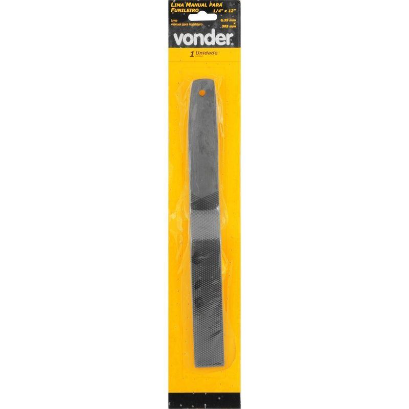 Lima Manual Para Funileiro 1/4'' X 12'' VonderMarca: VonderConteúdo da Embalagem:1 LimaDestaques e diferenciais:Possui formato especial que facilita o manuseioAplicações e dicas de uso:Indicada para trabalhos em funilariaCaracterísticas Técnicas:Comprimento da lima: 12 - 305 mm Tipo do picado da lima: Duplo - BASTARDA Tipo de serrote: Carpinteiro