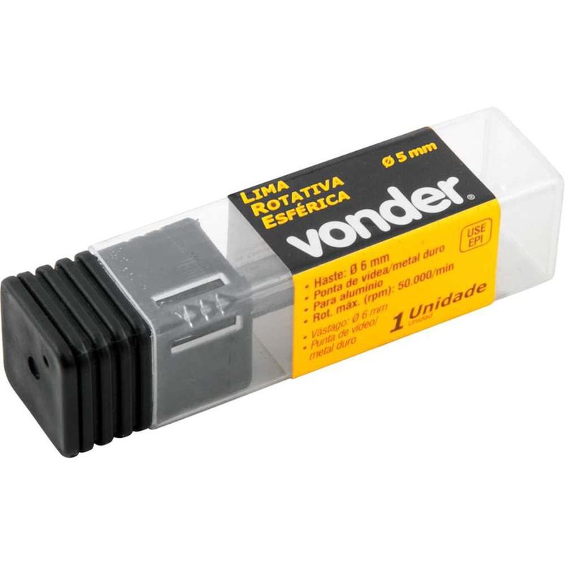 Lima Rotativa Esférica Para Alumínio, 5,0 mm x 5,0 mm, com Haste 6,0 mm, Vonder OstenVonder - Conteúdo da embalagem: 1 Lima rotativa. Aplicação: Utilizada em retificadeira indicada para desbaste e acabamento em alumÃnio. Destaques: Ponta de vÃdea/metal duro, proporcionando maior vida útil, com geometria e ranhura apropriada para desbastes em peças de alumÃnio, com alto poder de remoção proporcionandondo agilidade e melhor acabamento no produto. Referência: 4312600506 Garantia - E (CDC): Garantia legal: 90 dias Massa aproximada (peso): 0,015 kg Modelo: Esférica Diâmetro da haste: 6,0 mm Comprimento total: 45,0 mm Diâmetro: 5,0 mm Comprimento útil: 5,0 mm Formato da lima: Esférica Rotação máxima - rpm: 22.000/min Destaques Comercial: Ponta de vÃdea para desbaste em alumÃnio, com geometria e ranhura que aumentam vida útil e acabamento. Aplicação Comercial: Utilizada em retificadeira para desbaste e acabamento em alumÃnio. Características Gerais do Produto: Garantia: • 3 Meses