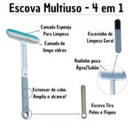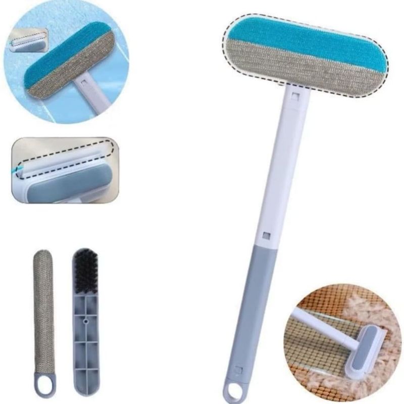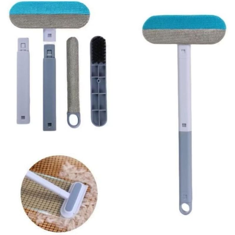 Escova multifuncional para higienização de superfícies sólidas e têxteis. O item possui quatro funções integradas para remoção de resíduos em vidros, azulejos, sofás e telas. Estrutura composta por cabo extensor e cabeça com cerdas de poliéster para coleta de partículas e pelos.Características do Produto:Cerdas em poliéster para fricção em tecidos.Lâmina integrada para raspagem de líquidos em vidros.Cabo longo com medida de quarenta e três centímetros.Estrutura principal em plástico de alta densidade.Cabeça de limpeza com largura de dezoito centímetros.Design com encaixe para alcance em ângulos difíceis.Orifício no cabo para armazenamento em suportes.Material resistente ao contato com água e sabão.Peso reduzido para manuseio prolongado sem esforço.Composição sólida em tons de cinza e branco.FICHA TÉCNICA E CONTEÚDOFicha Técnica:Tipo: Escova MultifuncionalFunções: 4 em 1Material Cabeça: PlásticoMaterial Cerdas: PoliésterCor: CinzaAltura Total: 43 cmLargura Cabeça: 18 cmUso: Vidros, Tecidos, AzulejosCabo Incluído: SimPeso: 150g (estimado)Formato: Manual com extensorLimpeza: LavávelConteúdo da Embalagem:?01 Escova de Limpeza Cabeça Dupla01 Cabo Extensor