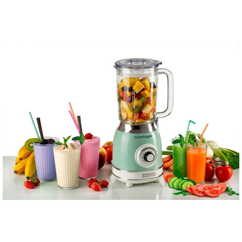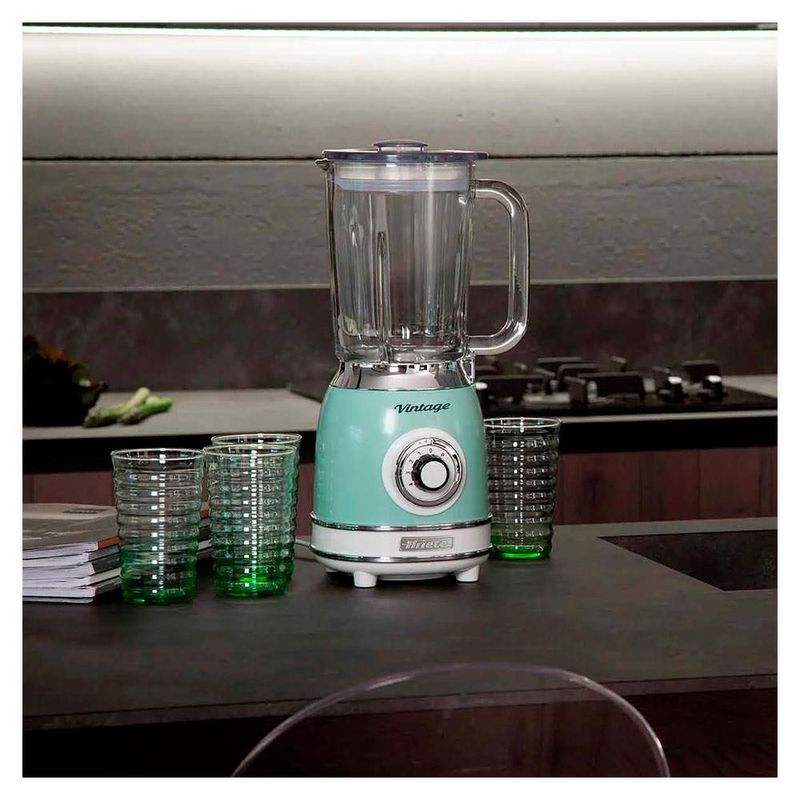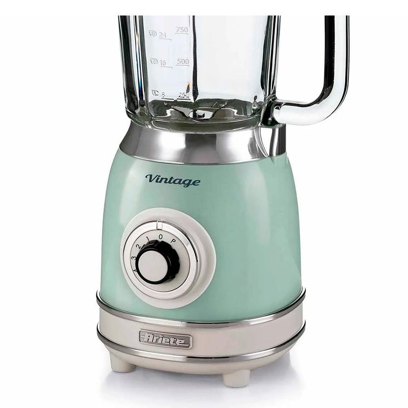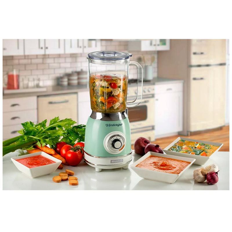 Com o Liquidificador Vintage com copo de vidro da Ariete você pode preparar a bebida de sua preferência todos os dias, misturando os ingredientes e batendo-os uniformemente. O copo de vidro é resistente e as 4 lâminas de aço inox, aliadas às 4 velocidades disponíveis, são ideais para triturar tudo o que você preferir. Além disso, graças à conveniente tampa medidora, você pode inserir os ingredientes diretamente no copo do liquidificador pelo orifício na parte superior. O desempenho de um excelente liquidificador e o design típico da linha Vintage da Ariete se unem em um liquidificador perfeito para dar um toque de estilo retrô à sua cozinha.CaracterísticasMaterial do Copo: VidroFunções: misturar, esmagar, transformar em purê ou emulsificar alimentos ou outras substâncias.Velocidades: 4Capacidade do Copo: 1,5 LitrosFunção Pulsar Base antiderrapanteLâminas em Aço Inox: 4Especificações TécnicasModelo: 583Potência: 1000 WConsumo de Energia: 1,0 Kwh/mêsCor: VerdeVoltagem: 110V/220V (Não é bivolt)EAN: 8003705123021 (110V) / 8003705119376 (220V)Garantia: 12 mesesDimensões e PesoDimensões do produto sem embalagem (AxLxP): 405x185x215 mmDimensões do produto com embalagem (AxLxP): 430x225x225 mmPeso do produto sem embalagem: 3,96 KgPeso do produto com embalagem: 4,54 KgItens Inclusos01 LiquidificadorAgente ValidadorProduto possui certificação de segurança compulsória, certificado pela BRA23/00580, organismo acreditado pela CGCRE do Inmetro.