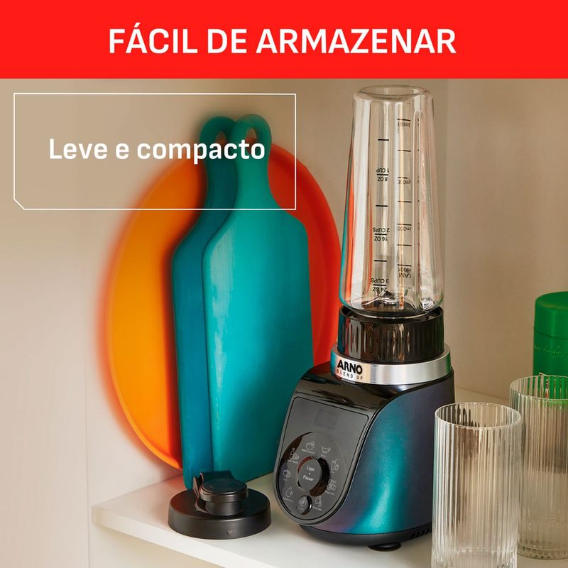 Arno Blend Up é o liquidificador compacto ideal pra quem busca o resultado perfeito para suas melhores receitas, com a máxima praticidade e alto desempenho. Motor super potente com 1000W e a exclusiva tecnologia Powelix, ele oferece desempenho até 3x mais eficiente. Possui 8 programas automáticos, para preparar leite vegetal, suco, molho cremoso, molho, sopa, triturar gelo, além do modo silencioso e auto limpeza. Acompanha 2 garrafas inquebráveis de Tritan*, de 400ml e 700ml, perfeitas para levar na mochila, para a academia, trabalho ou onde você estiver e beber direto no copo. Ele também conta com lâminas removíveis, modo de limpeza automática e escova inclusa, que tornam a higienização muito mais prática no dia a dia. Além disso, o produto é integrado ao app da Arno, com mais de 100 receitas saudáveis para inspirar sua rotina e facilitar seus preparos. Com design compacto e funcional, o Arno Blend Up é a solução ideal para quem busca uma alimentação equilibrada, com agilidade, eficiência e praticidade todos os dias. *Tritan™ é altamente resistente a impactos e quedas, podendo apresentar danos em condições extremas. CaracterísticasMaterial da Garrafa: TritanCapacidade da Garrafa 1: 700 mlCapacidade da Garrafa 2: 400 mlLâminas RemovíveisModo SilêncioModo Limpeza Automática Especificações TécnicasModelo: UP00Potência: 1000WVoltagem: 110V / 220V (não é bivolt)Cor: Azul e PretoEAN: 3016667298954 (110V) / 3016667299197 (220V)Garantia: 12 meses Dimensões e PesoDimensões do produto sem embalagem (AxLxP): 281x128x182 mmDimensões do produto com embalagem (AxLxP): 388x155x467 mmPeso do produto sem embalagem: 10,50 KgPeso do produto com embalagem: 10,50 Kg Itens Inclusos01 LiquidificadorManual de Instruções