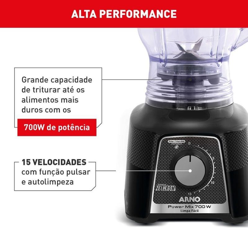 Liquidificador Arno Powermix 700W LQ33 Preto 220VLiquidificador Arno Powermix 700W com 15 Velocidades - PretoO Liquidificador Arno Powermix LQ33 é a combinação perfeita de potência, praticidade e durabilidade que vai transformar a sua cozinha. Com um motor superpotente de 700W e 15 velocidades, ele enfrenta qualquer desafio, desde a vitamina mais cremosa até as massas mais homogêneas, garantindo misturas perfeitas em segundos.Principais Características:Alta Potência de 700W com 15 Velocidades: O motor potente, aliado às 15 velocidades e à função Pulsar, oferece o controle preciso para cada tipo de receita, garantindo a textura ideal para todos os seus pratos.Sistema Limpa Fácil com Lâminas Removíveis: A limpeza ficou muito mais simples e segura. Com um clique, você retira a base das lâminas para uma higienização completa, sem deixar restos de alimentos.Lâminas de Aço Inox Super-resistentes: As lâminas de alta performance trituram até os ingredientes mais duros, como gelo e frutas congeladas, garantindo misturas lisas e homogêneas.Copo Robusto de Grande Capacidade: A jarra em SAN Cristal com 2,5 litros de capacidade total é super-resistente, não absorve odores e é ideal para preparar receitas para toda a família.Especificações Técnicas:Marca: ArnoModelo: Powermix LQ33Voltagem: 220VEAN: 7895500726757Tipo: LiquidificadorPotência: 700WCapacidade da Jarra: 2,5 L (Total) / 1,4 L (Útil)Velocidades: 15 + PulsarCor: PretoPeso: 1,8 kgDimensões [AxLxP]: 40 x 20,2 x 17,6 cmGarantia: 12 meses