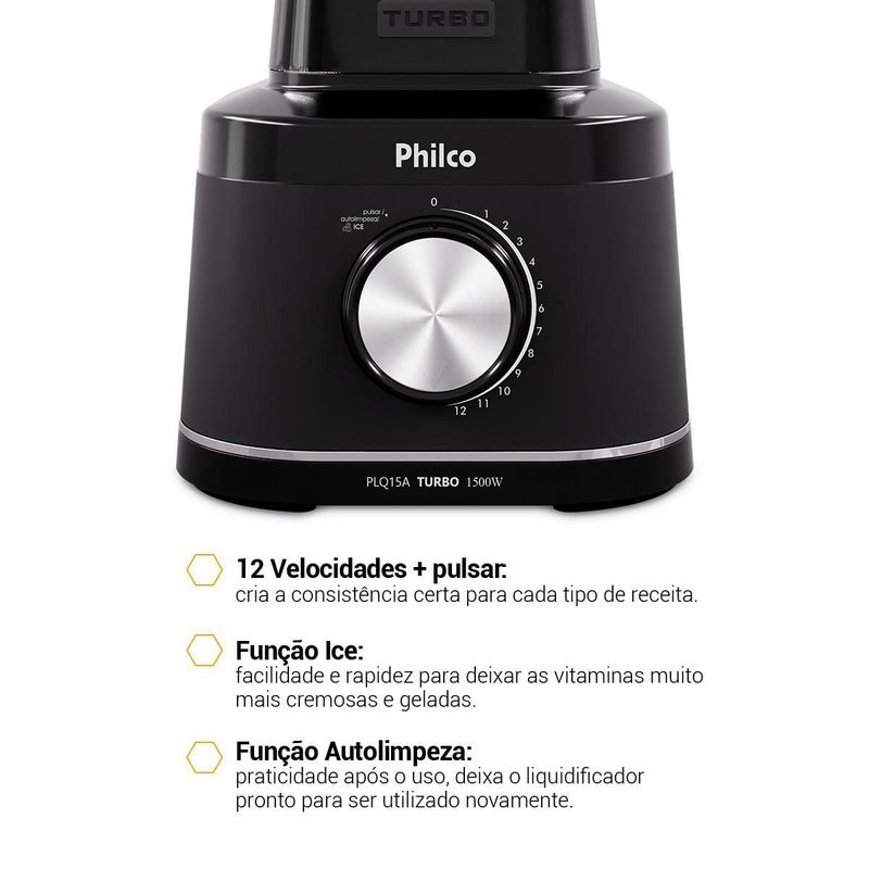 Descubra o Liquidificador Philco 1500W 12 velocidades 3,1L PLQ15A, da linha Concept Philco, e transforme sua cozinha em um espaço de praticidade e sabor. Com 1500W de potência e 12 velocidades, ele tritura, mistura e prepara desde sucos e vitaminas até receitas mais elaboradas, incluindo trituração de gelo, com eficiência e rapidez. A tecnologia Pro Maxx 6, com 6 lâminas de alto poder de trituração, garante resultados perfeitos em cada uso. Com capacidade total de 3,1 litros, ele é ideal para preparar grandes quantidades de uma só vez, perfeito para famílias. A função ice deixa suas vitaminas cremosas e geladas, enquanto a tampa com sobretampa dosadora permite adicionar ingredientes sem erros. Além disso, a função autolimpeza facilita a higienização, deixando o liquidificador pronto para o próximo uso.Eleve sua experiência na cozinha com o Liquidificador Philco PLQ15A. Desfrute de praticidade, desempenho e resultados incríveis em cada receita!• Capacidade total da jarra/copo: 3,1 litros• Capacidade útil da jarra/copo: 2 litros• Função pulsar • Suporte para armazenar o cordão • Potência: 1500W• Material da jarra / Copo: San• Material das lâminas: Aço• Tipo de lâminas: Faca de 6 lâminas• Velocidades: 12 velocidades• Quantidade de facas: 01 faca com 6 lâminas.