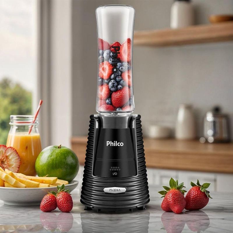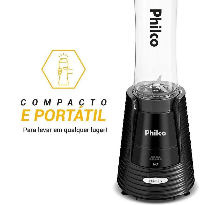 Liquidificador Philco Portátil 2 Squeezes 400W PLQ04A 110VDescubra a praticidade e eficiência do Liquidificador Philco Portátil 2 Squeezes 400W PLQ04A, ideal para quem busca uma vida saudável e dinâmica.Compacto e portátil, este liquidificador é perfeito para levar a qualquer lugar, permitindo preparar shakes e smoothies de maneira fácil e rápida. Acompanha dois squeezes com tampa e capacidade de 600ml, oferecendo autonomia para preparar muito mais.Sinta a potência das quatro lâminas que garantem alto poder de trituração, transformando frutas e vegetais em bebidas deliciosas e nutritivas. A segurança é prioridade: o aparelho só funciona quando o copo está encaixado e travado corretamente, proporcionando tranquilidade no uso diário.Adquira o Liquidificador Philco Portátil e transforme sua rotina com praticidade e bem-estar. Ideal para famílias, jovens adultos, estudantes, profissionais com rotina corrida, veganos e vegetarianos, este produto é a escolha perfeita para quem prioriza saúde e conveniência. Garanta já o seu e desfrute de uma experiência culinária única!Capacidade total e útil da jarra/copo: 600mlPotência: 400WMaterial da jarra / Copo: SANLâminas em Inox1 velocidade4 facas 2 squeezes com tampaCor produto: PretoMaterial / composição: Metal e plásticoTamanho do cordão: 90cmTomada: 10A2 pinos.Especificações Técnicas:Marca: PhilcoCor: PretoPotência (W): 400WCapacidade do copo: 600mlVelocidades: 1Modelo: PLQ04AEstado: NovoFunção Ice: NãoAcompanha filtro: NãoMaterial do copo: PlásticoFunção pulsar/autolimpeza: NãoSobretampa: NãoQuantidade de lâminas: 4Tipo das lâminas: LisasTipo de alimentação: Energia ElétricaAltura do produto: 39,5 cmLargura do produto: 13,5 cmComprimento do produto: 13,5 cmPeso do produto: 1,08 kgAltura com embalagem: 22,4 cmLargura com embalagem: 22 cmComprimento com embalagem: 16,2 cmPeso com embalagem: 1,34 kgGarantia (Dias): 360Observação: Somente faturamos para o nosso consumidor final, ou seja, não faturamos pedidos para CNPJ por este portal de vendas;
