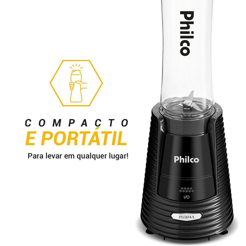 Descubra a praticidade e eficiência do Liquidificador Philco Portátil 2 Squeezes 400W PLQ04A, ideal para quem busca uma vida saudável e dinâmica.Compacto e portátil, este liquidificador é perfeito para levar a qualquer lugar, permitindo preparar shakes e smoothies de maneira fácil e rápida. Acompanha dois squeezes com tampa e capacidade de 600ml, oferecendo autonomia para preparar muito mais.Sinta a potência das quatro lâminas que garantem alto poder de trituração, transformando frutas e vegetais em bebidas deliciosas e nutritivas. A segurança é prioridade: o aparelho só funciona quando o copo está encaixado e travado corretamente, proporcionando tranquilidade no uso diário.Adquira o Liquidificador Philco Portátil e transforme sua rotina com praticidade e bem-estar. Ideal para famílias, jovens adultos, estudantes, profissionais com rotina corrida, veganos e vegetarianos, este produto é a escolha perfeita para quem prioriza saúde e conveniência. Garanta já o seu e desfrute de uma experiência culinária única!Capacidade total e útil da jarra/copo: 600mlPotência: 400WMaterial da jarra / Copo: SANLâminas em Inox1 velocidade4 facas 2 squeezes com tampaCor produto: PretoMaterial / composição: Metal e plásticoTamanho do cordão: 90cmTomada: 10A2 pinos.