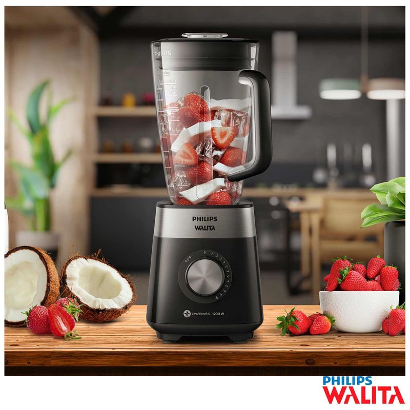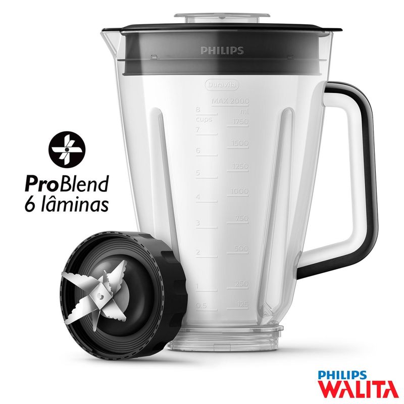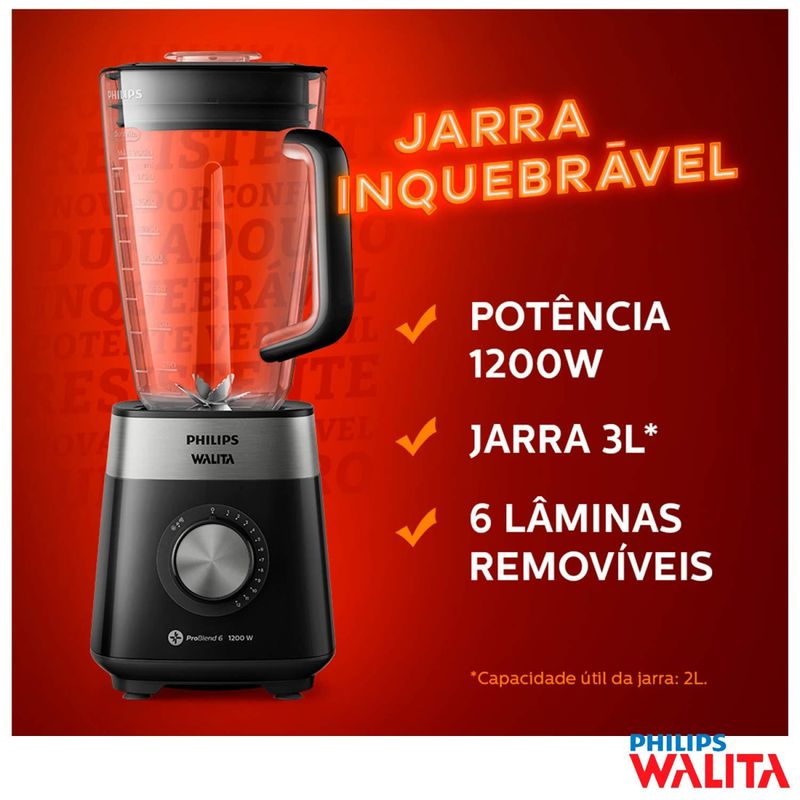 Liquidificador Philips Walita Problend com 12 Velocidades e Jarra Tritan com 3,0 Litros Preto - RI2242Você procura por um liquidificador potente e versátil para facilitar o preparo das suas receitas? Conheça o Liquidificador Philips Walita Problend com 12 Velocidades e Jarra Tritan com 3,0 Litros. Com design moderno e funcionalidades avançadas, ele se torna o parceiro ideal na sua cozinha.Características:- Material do Copo: Tritan- Velocidades: 12- Capacidade do Copo: 3,0 Litros- Função Pulsar- Lâminas Removíveis- Porta-fio- Base AntiderrapanteEspecificações Técnicas:- Modelo: RI2242/91 (110V) / RI2242/90 (220V)- Potência: 1200 W- Consumo de Energia: 1,2 kW/h- Voltagem: 110V / 220V (não é bivolt)- Cor: Preto- EAN: 8710103950622 (110V) / 8710103952695 (220V)- Garantia: 24 mesesDimensões e Peso:- Dimensões do produto sem embalagem (AxLxP): 420x165x165 mm- Dimensões do produto com embalagem (AxLxP): 365x286x223 mm- Peso do produto sem embalagem: 2,12 kg- Peso do produto com embalagem: 2,54 kgItens Inclusos:- 01 Unidade Motora- 01 Copo- 01 Tampa- 01 Sobre Tampa- 01 Manual- 01 GarantiaCertificação Inmetro:- Produto possui certificação de segurança compulsória, certificado pela UL TESTTECH, organismo acreditado pela CGCRE do Inmetro.